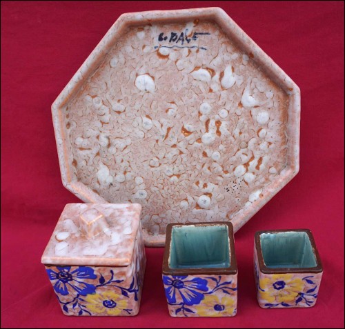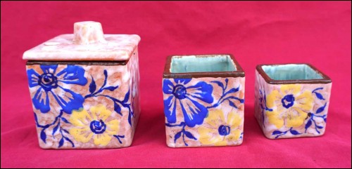 Ensemble en céramique pour nécessaire de fumeur, par Louis Dage (1885-1963) Dimensions: pour le plateau 23.5 cm de coté, pour le plus grand pot: hauteur 7 cm par arrête, pour le moyen: hauteur 6.2 cm, 6 de section, pour le pus petit! hauteur 5.2 cm, 5 cm par arrête. Le plateau est signé. Bel état, une égrenure sur le bord du plus grand pot.