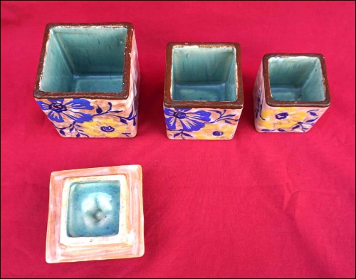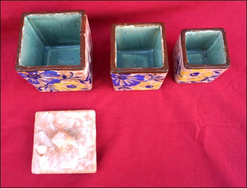 French Art Deco enameled ceramic set including tray and 3 square jar, probably smoker set, made by Louis Dage (1885-1963). The tray is signed. They measure for the tray 9 1/4" (23.5cm) by side, for the largest pot 2 3/4" (7cm) height and 2 3/4" (7cm) by side, for the medium 2 3/8" (6cm) height and 2 3/8" (6cm) by side, for the smallest 2" (5cm) height and 2" (5cm) by side. Good condition a tiny chip on the edge of the largest pot as shown by the following pictures.