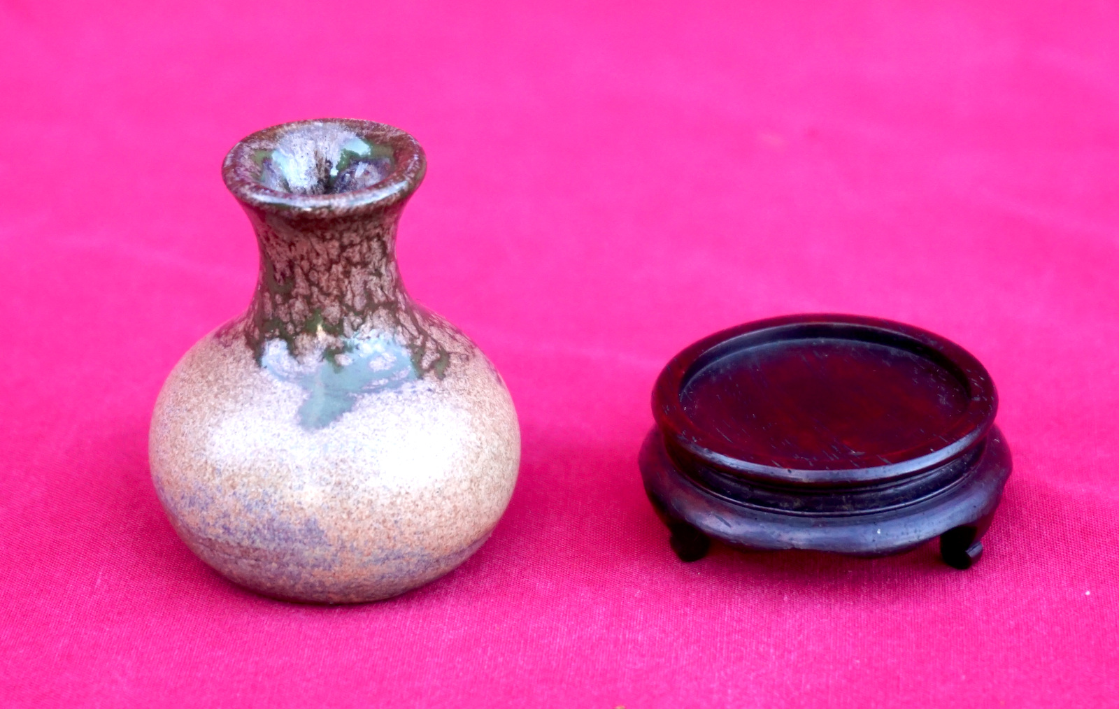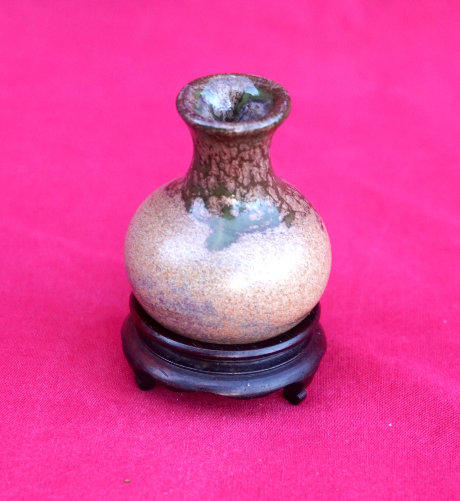 Petit vase en grès émaillé sur un socle en bois par Emile Mousseau dit Marlotte (1866-1941) vers 1930. Il est signé sur son fond. Hauteur 4.5 cm, diamètre 3.5 cm. Parfait état.