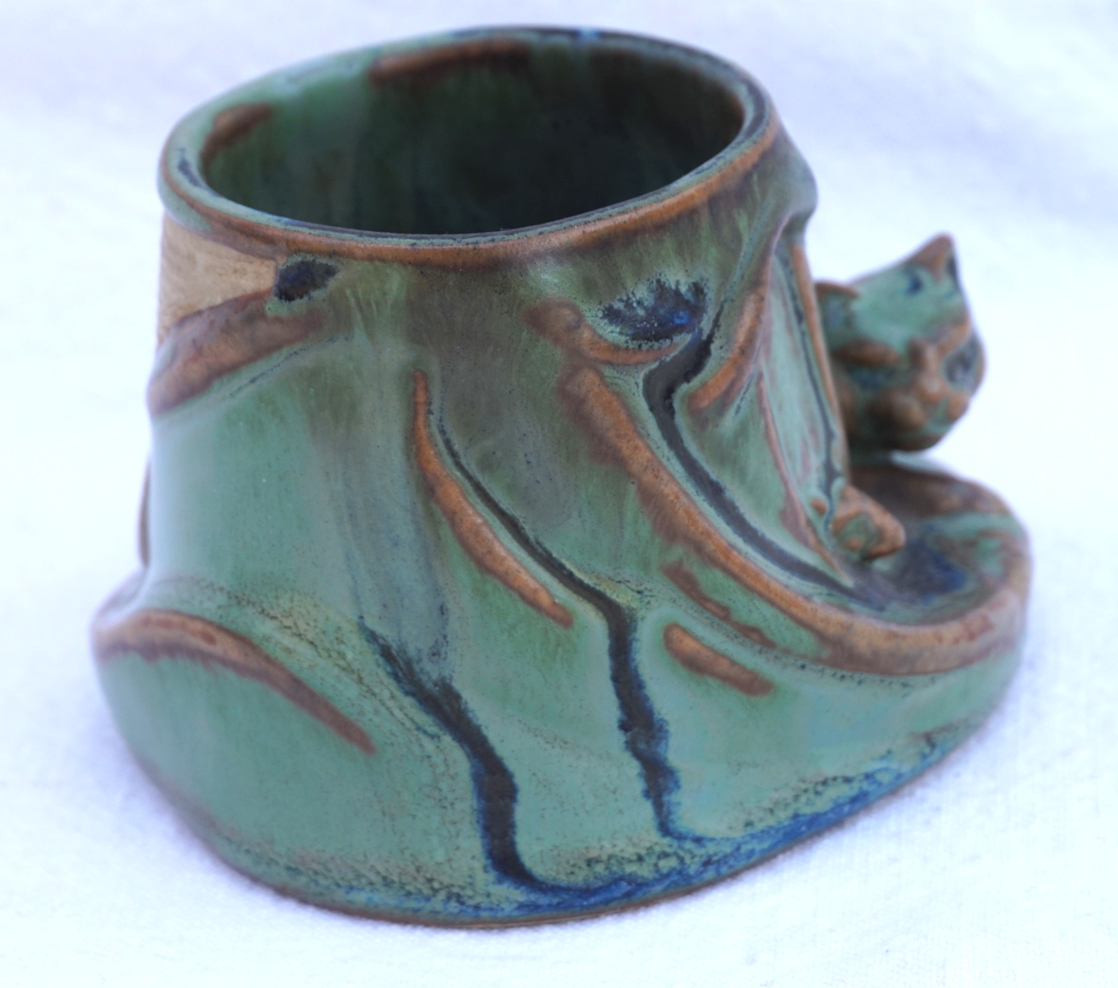 Pyrogène en grès émaillé, représentant un chat chassant une souris Denbac vers 1910, période Art Nouveau. Il est signé sur son fond. Hauteur 6.3 cm, largeur 8.5 cm, profondeur 8 cm. Parfait état.