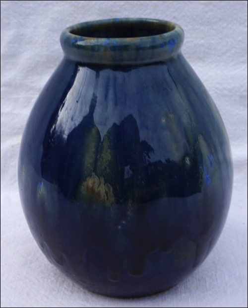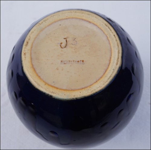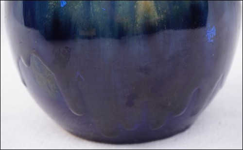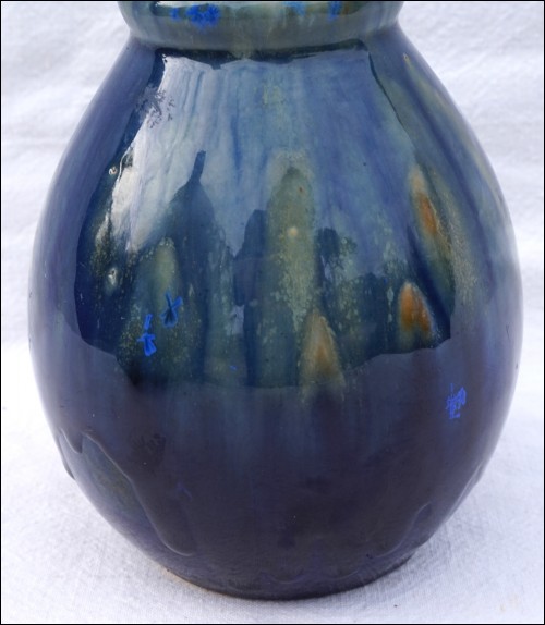 rench Art Nouveau crystalline glaze and enameled stoneware vase made in Pirrefonds during the 1910's. It's signed and numbered J3 on the back. 5 1/2" (14cm) height, 4 3/4" (12cm) diameter to the body. Perfect condition as shown by the following pictures.