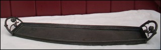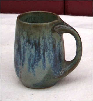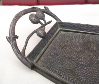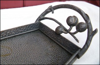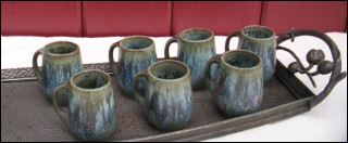 This liqueur set with 1 bottle and 7 cups in sea shades with its original hammered tray in silver nikel made by Denbac around 1925 in an Art Nouveau form and charming arts and crafts glazes It is in mint condition and signed Denbac on the bottom with the number 124 for the bottle and n°191 for the liqueur cups. 8 6/8" tall, 3 1/2"diameter for the bottle and 2" tall, 1 3/8" diameterfor the cup, for the tray 18 3/4" length 5 " width. Denbac biography: This art pottery was made between 1909 and 1952 in Vierzon, France. The pottery was formed by a talented artist/ceramist, René Denert, and his business partner, René-Louis Balichon - hence the name, Denbac. Modern style molding and complex coloring and glazes were their trademarks. Unfortunately, after the war and the deaths of the two partners, a pottery that was more about art than production could not last and it closed in 1952.