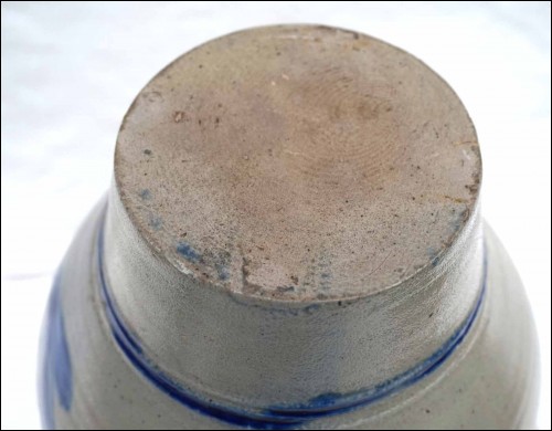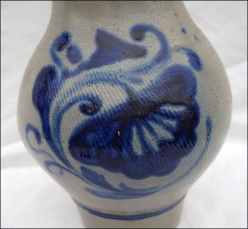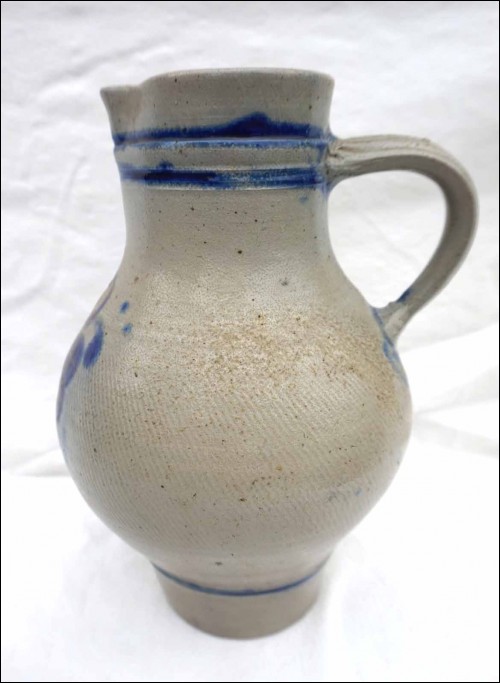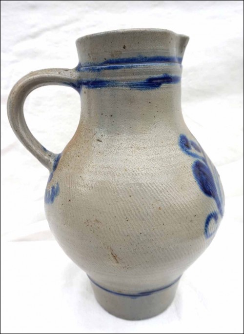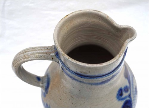 Grand pichet à eau à décor floral bleu en grès au sel de Betschdorf, Alsace. Hauteur 32 cm, largeur avec l'anse 21 cm, diamètre au corps 19 cm. Très bel état.