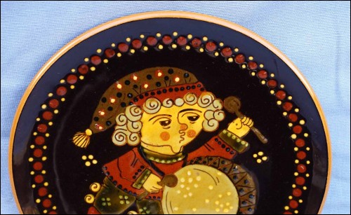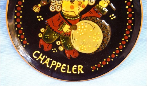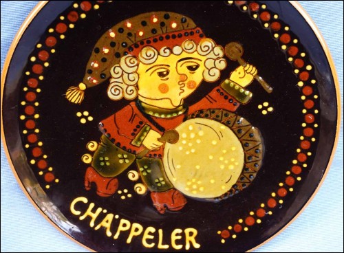 Vintage Swiss hand painted majolica plate showing day of crepe pancake for Candlemass made by Alfred Beer in Herblingen during the 1970's. It's signed on the back. 8 1/4" (20.8cm) diameter. Perfect condition with 2 holes for hanging as shown by the following pictures.