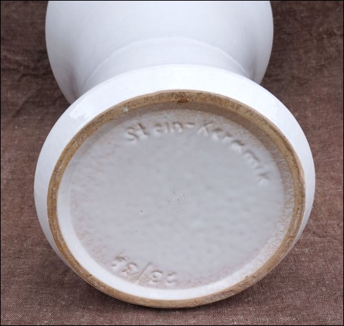 Vintage enameled stoneware large 14 1/8" vase white outside and brown inside made by Stein Keramik Germany during the 1970's. It's stamped on the back and numbered 23/35. 14 1/8" height 10 1/4" diameter. Perfect condition two tiny glaze shortages as presented on the following pictures.