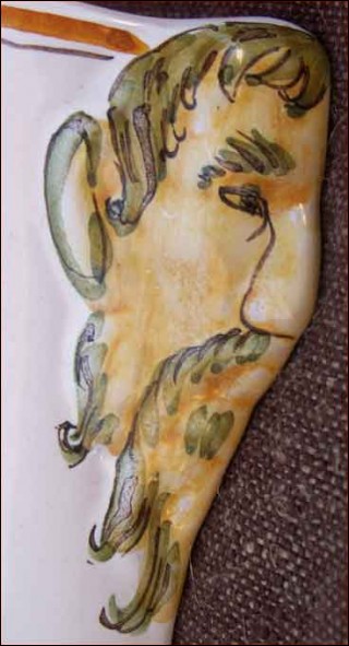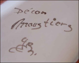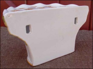 Jardinière de table ou murale en faïence de Moustier à décor de fleurs et sculptures de vieillards, vers 1960. Bon état. Hauteur 10 cm, Largeur 19.5 cm, profondeur 9.5 cm.