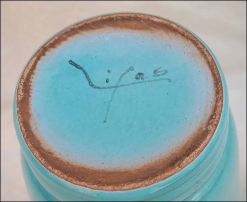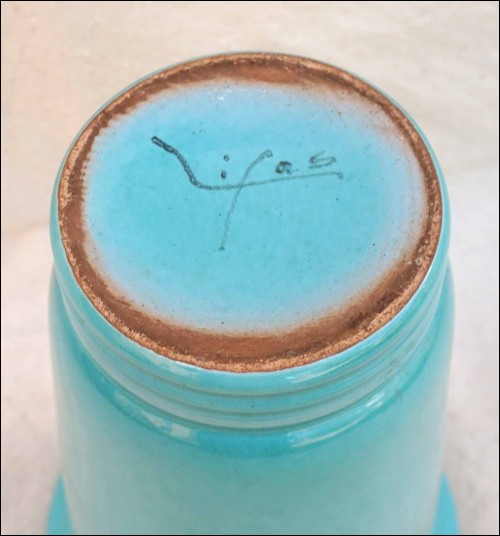 French Art Deco celadon faience vase made by Alice Sordet- Bonifas (1902-1975) named Lifas in the Paul Bonifas studio in Freney-Voltaire during the 1930's. It's signed on the bottom, ref Seattle Art Museum. 8 7/8" (22.5cm) height, 5 7//8" (15cm) diameter to the top. Perfect condition as shown by the following pictures.