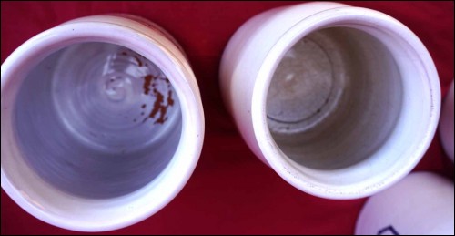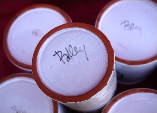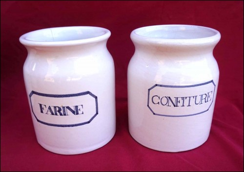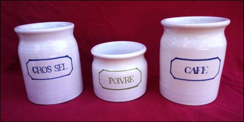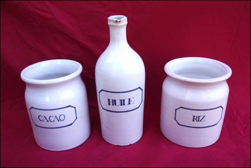 Ensemble de pot à épices et une bouteille pour l'huile, faïence émaillés ornés d'étiquettes peintes, Claude et Slavik Palley vers 1970. Signés sur leurs fonds. Claude et Slavik Palley sont exposés au Musée de la céramique de Sèvres. Dimensions pour la bouteille: hauteur 23 cm, diamètre 8,3 cm, pour les grands pots hauteur 14 cm, diamètre 10,8 cm, le petit hauteur 9 cm, diamètre 10,8 cm. Bel état, la bouteille à quelques éclats et deux pots ont le fond craquelé.