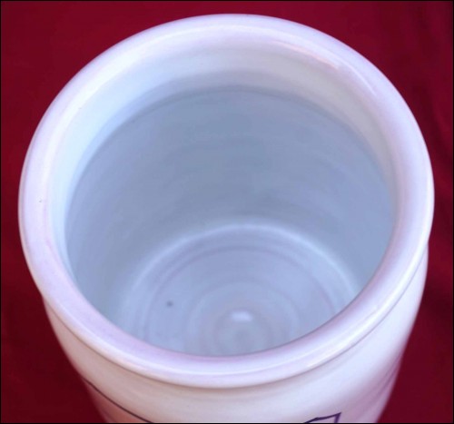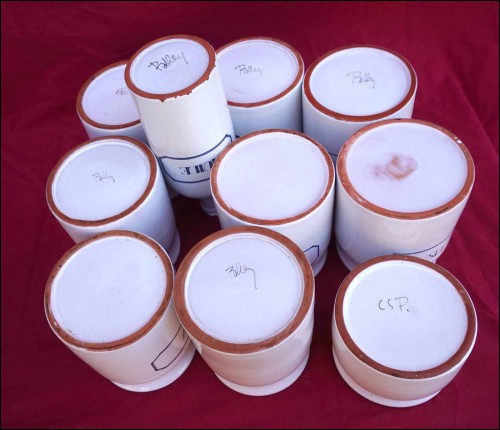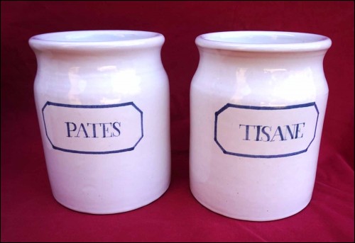 French hand painted faience canister set of 9 pots and 1 bottle with blue and green labels made by Claude and Slavik Palley during the 1970's. Claude and Slavik Palley works are displayed in Ceramic Museum in Sevres. They are signed on the bottom. They measure for the bottle 9" (23cm) height, 3 1/4" (8.3cm) diameter, for the largest pot 5 1/2" (14cm) height 4 1/4" (10.8cm) and for the smallest 3 1/2" (9cm) height 4 1/4" (10.8cm) diameter. Small chips onthe bottom of the bottle, one largest pot with hairline and two are crackled inside as shown by the following pictures.
