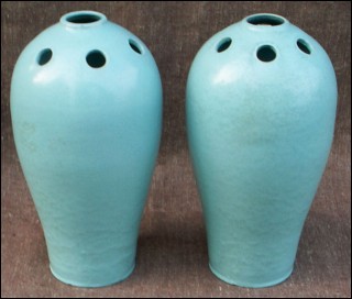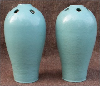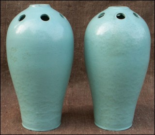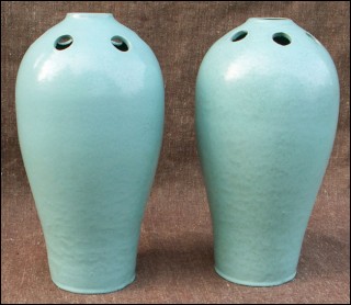 Pair of baluster vaes in turquoise ceramic made by Philippe Rouart artist during the 1940's Art Deco period. The ceramic with turquoise slip and salt glaze is percied on the top with siw holes and one central largest. Good condition small chips on the base of one vase as you can see on the pictures below. They are signed on the bottom. 11" high.