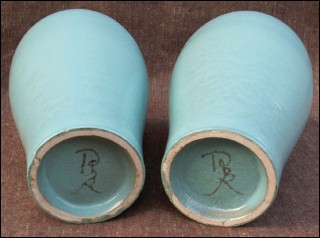 Paire de vases ovoïdes, vers 1940 par Philippe Rouart (1904-1993) céramique de forme balustre pansue se rétrécissant en partie inférieur, email bleu ceruleen. Embouchures étroites, au centre une sorte de col souligné d'un bourrelet en sa circonférence six autres trous. Bel état, petites égrenures à la base d'un vase, signés sur leurs fonds. Hauteur 27,7 cm.