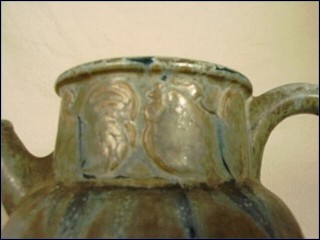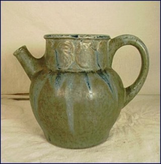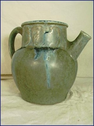 This pitcher in sea shades made by Denbac around 1918 in an Art Nouveau form and charming arts and crafts glazes. It has a large hand pressing border with 4 coquerels french symbol after the end of the first world warm. It is in mint condition and signed Denbac on the bottom. Denbac biography: This art pottery was made between 1909 and 1952 in Vierzon, France. The pottery was formed by a talented artist/ceramist, René Denert, and his business partner, René-Louis Balichon - hence the name, Denbac. Modern style molding and complex coloring and glazes were their trademarks. Unfortunately, after the war and the deaths of the two partners, a pottery that was more about art than production could not last and it closed in 1952.