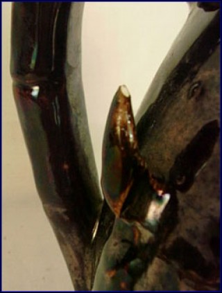 Pichet couvert en majolique de Vallauris par Placide Saltalamacchia, qui signe dès 1936 AGITNA. Cette réalisation à la couleur brun anthracite brillant et à la forme végétale est la nouvelle technique des années 1940. La famille Saltalamacchia a toujours su innover. Bon état malgré une petite grenure sur une protubérance de la coloquinte. Hauteur 27 cm.