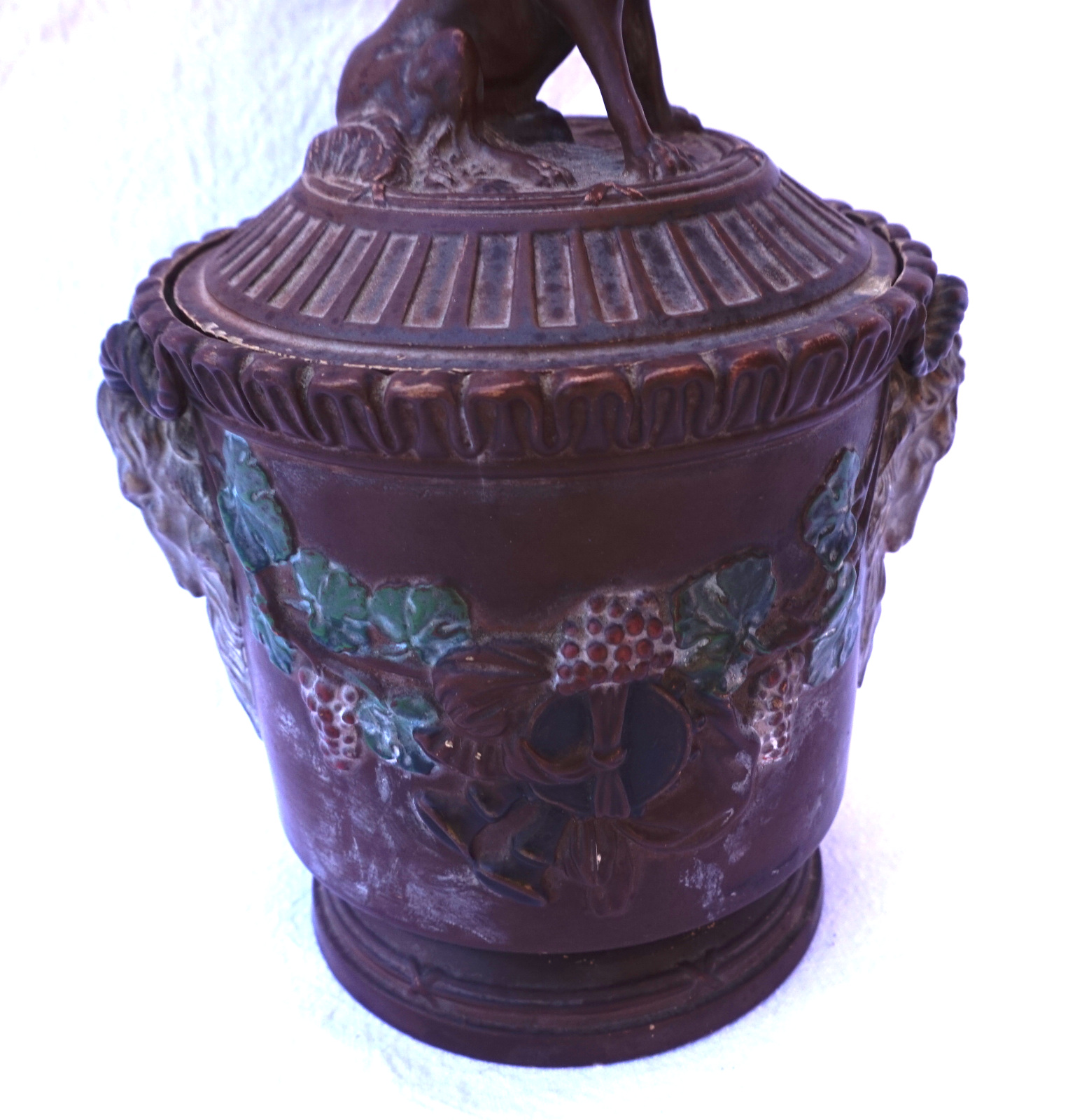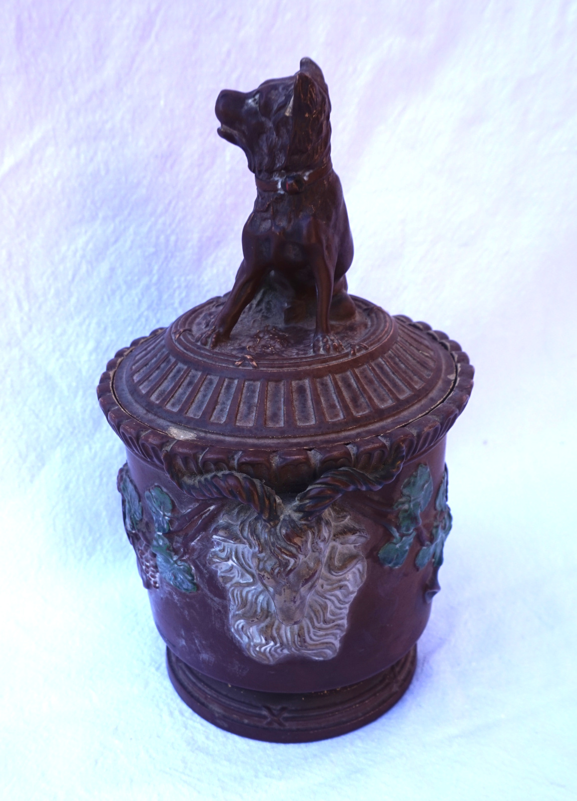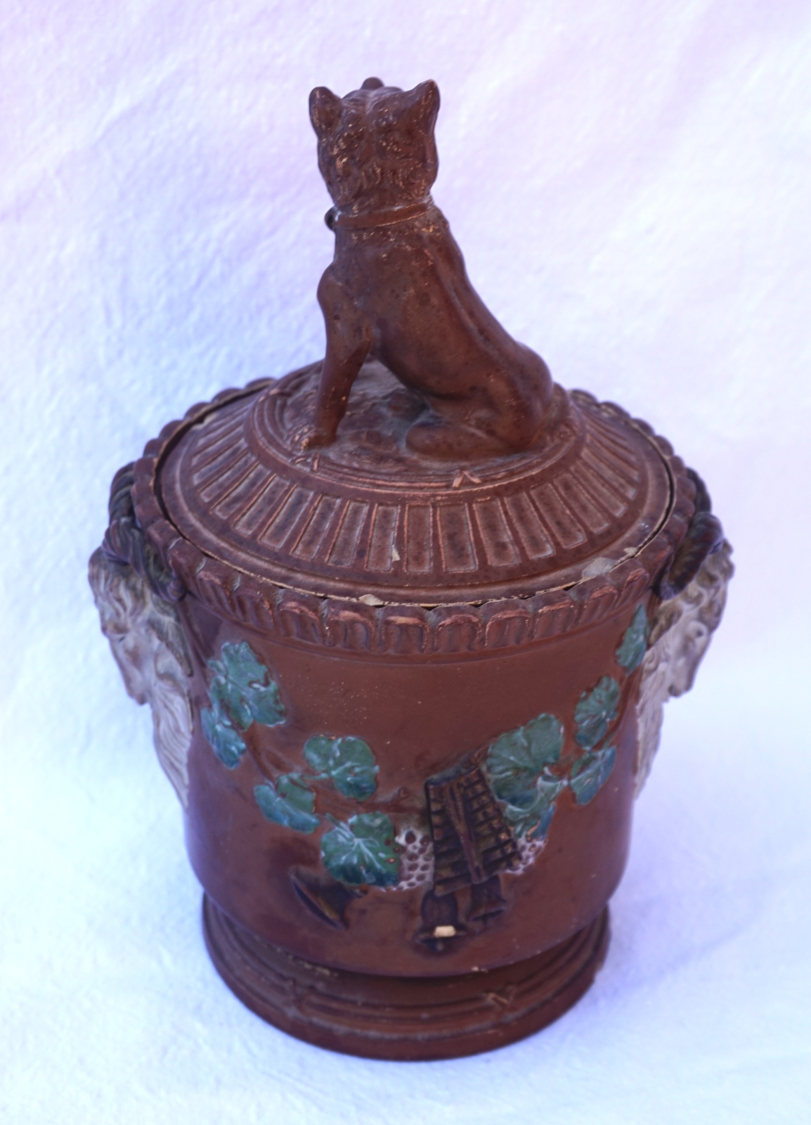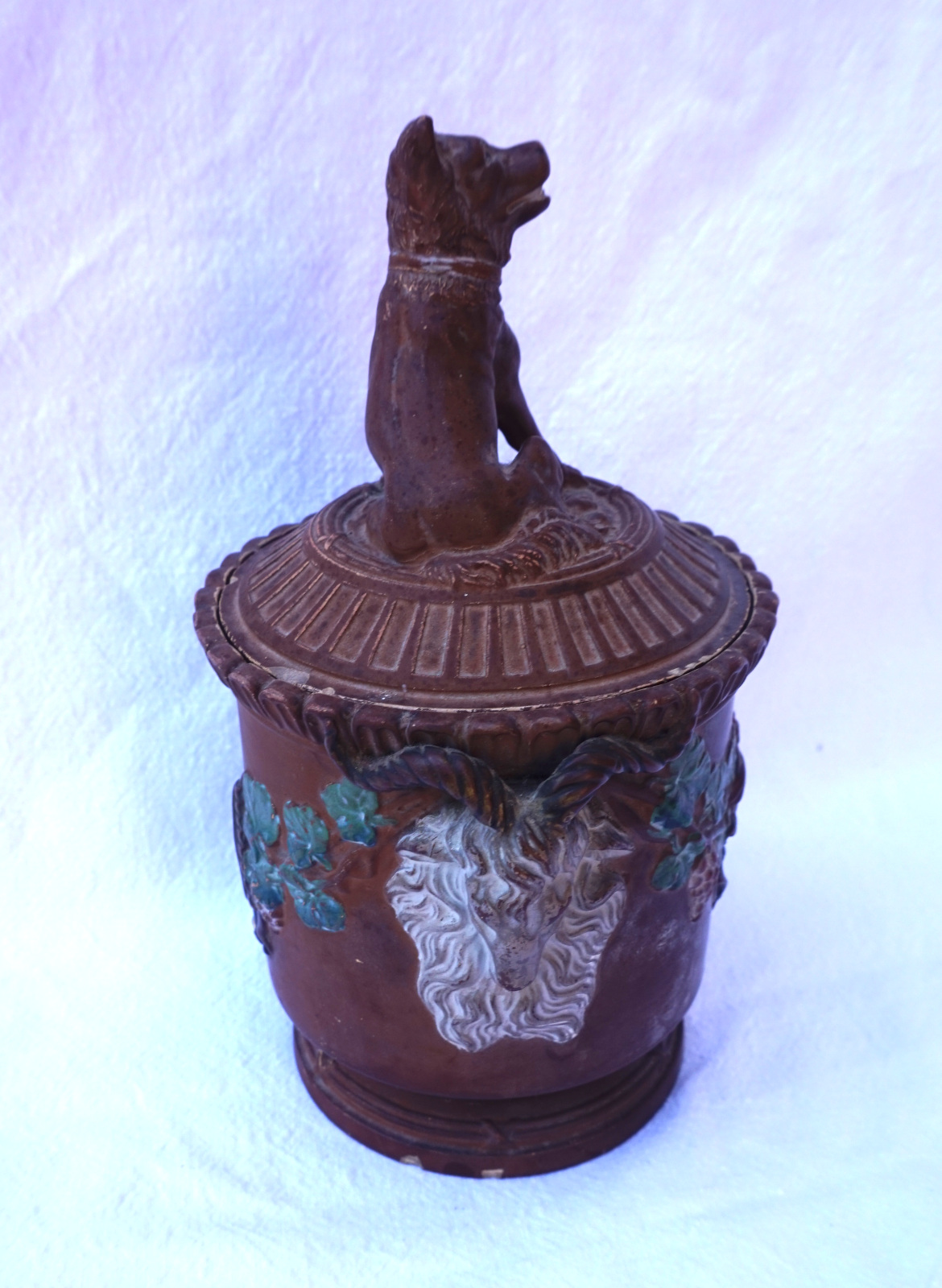 Victorian tobacco jar with embossed ram, grapes and dog pottery made by Cumberlidge & Humphreys during the 1880's. It's stamped on the back. 9" (22.8cm) height, 6" (15.2cm) diameter. Good condition small chip on the edge of the lid.