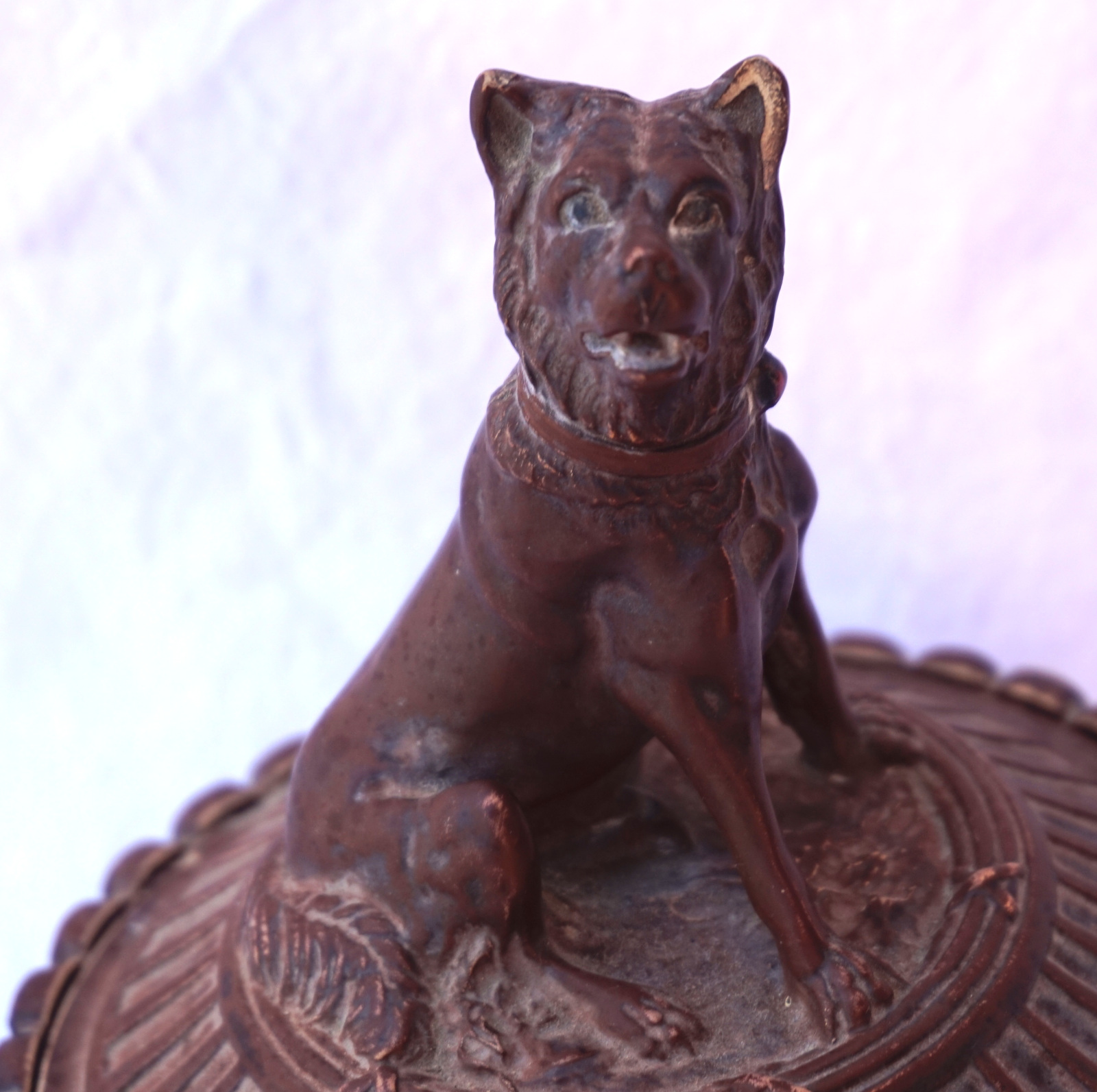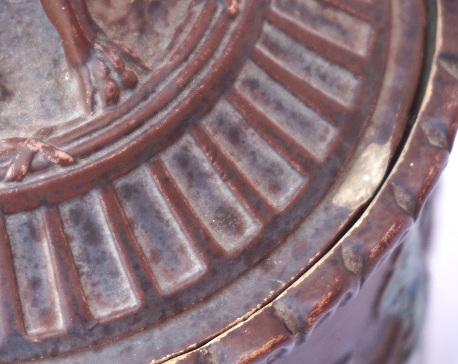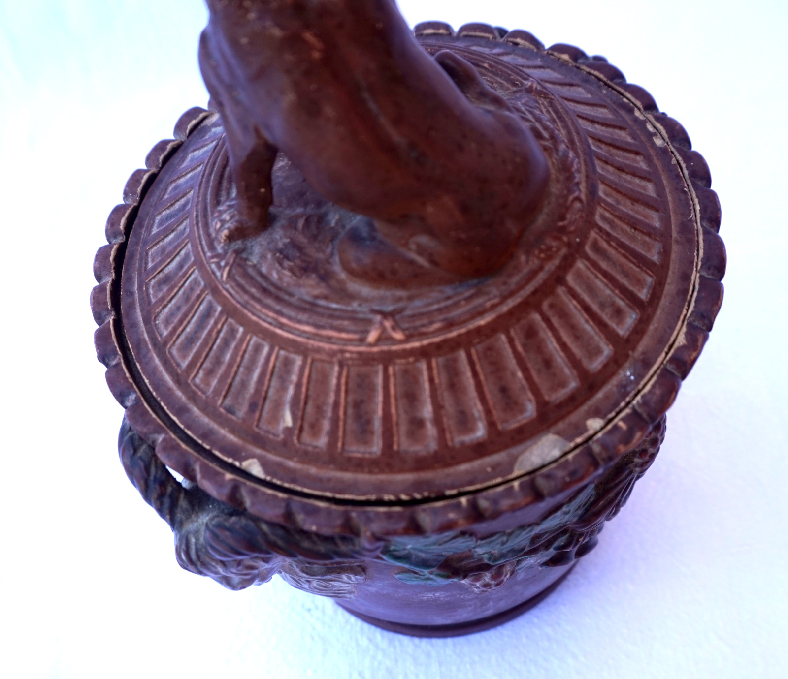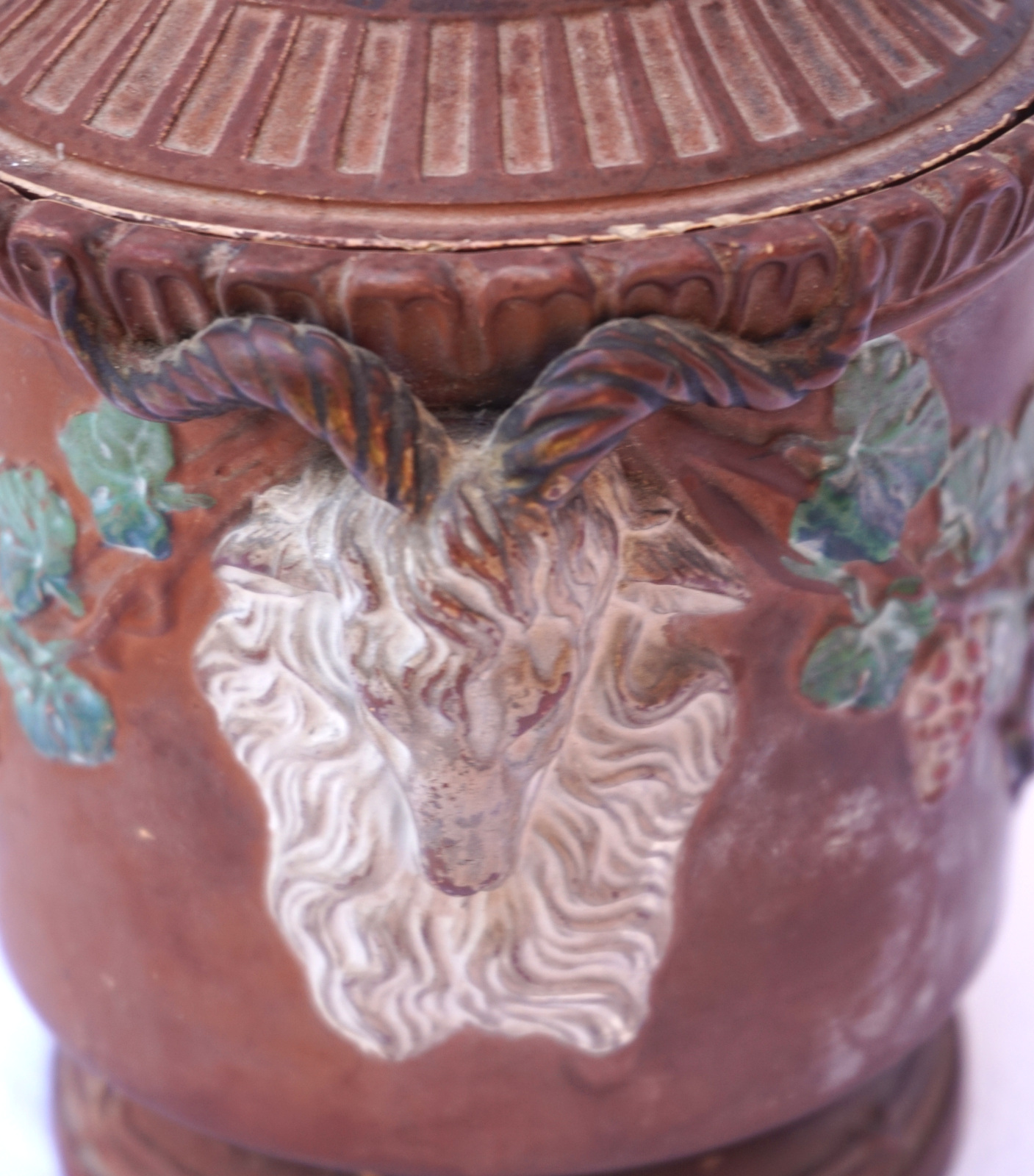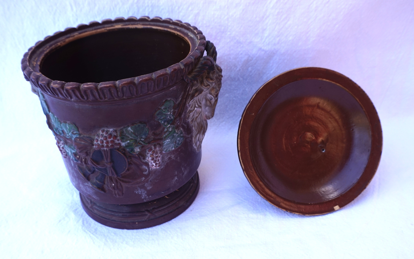 Victorian tobacco jar with embossed ram, grapes and dog pottery made by Cumberlidge & Humphreys during the 1880's. It's stamped on the back. 9" (22.8cm) height, 6" (15.2cm) diameter. Good condition small chip on the edge of the lid.