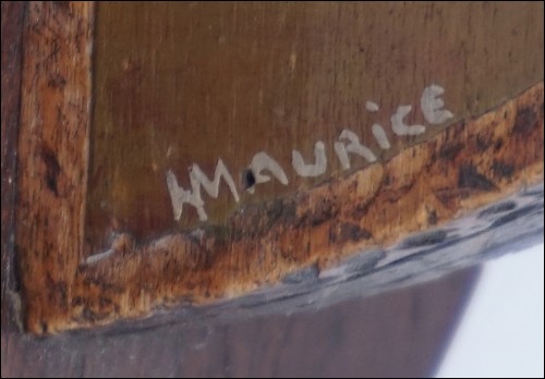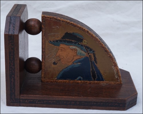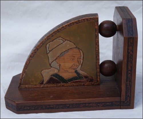 Paire de serre-livre signés N Maurice et un ouvre-lettre signé HG en bois pyrogravé polychrome, ornés de breton en buste, début XXe siècle. Bel état d'usage. Hauteur 19 cm, largeur 13 cm, épaisseur 11,5 cm.