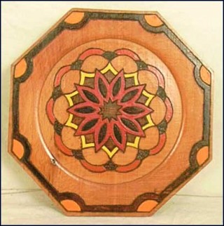 Paire d'assiettes octogonales en bois de hêtre pyrogravée et peinte à la main, de la période Odetta née vers 1935 à Quimper. Elles sont en bon état et une est signée peu lisiblement à la mine de plomb Odile Collobert. Diamètre 22 cm.