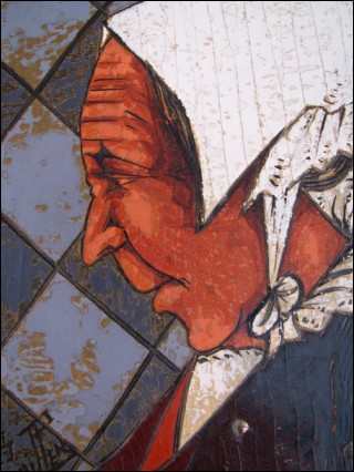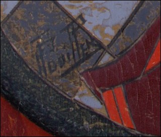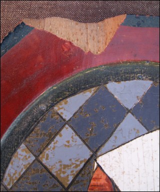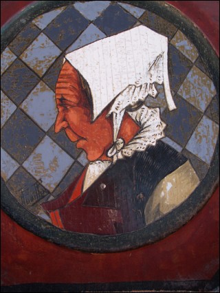 L'épouse, bois pyrogravé peint par Paul Fouillen, vers 1929. Assiette de décoration de son premier atelier de la Place du Styvel à Quimper, période Art Déco. Elle n'est pas en bon état, accidents, piqûres... l'oeuvre centrale est préservée. Elle est signée sur la face et au revers. Dimensions 24 cm par 25 cm.