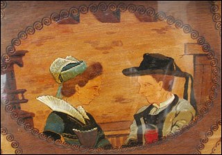 Vintage pyrography wooden tea tray made by the famous Armor artist near Quimper around 1950. The hand painting and pyrography pattern depicts a couple of Breton in traditional costume. It's signed Armor. The pyrography pattern is protected with glass. 17"1/8 length without handles and 9" width. Good condition.