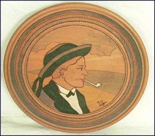 Assiette en bois pyrogravé des années 50 représentant un jeune Breton en costume traditionnel de Baud, près de Quimper. Signé S G. Diamètre 22 cm.