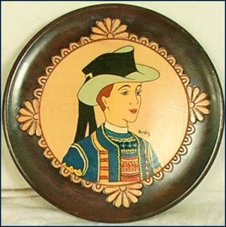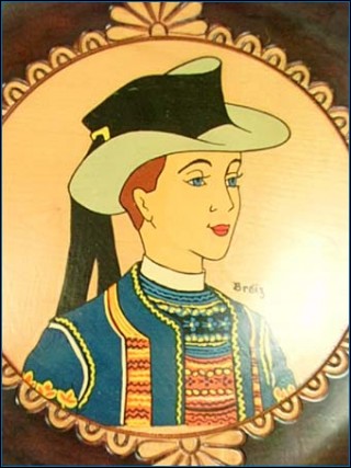 This wooden decorative plate has been made by Breiz in Quimper in 70's. The decal pattern show a young Breton in traditional costume surrounded by a large geometric carving border. Good condition signed on the face. 9" diameter.