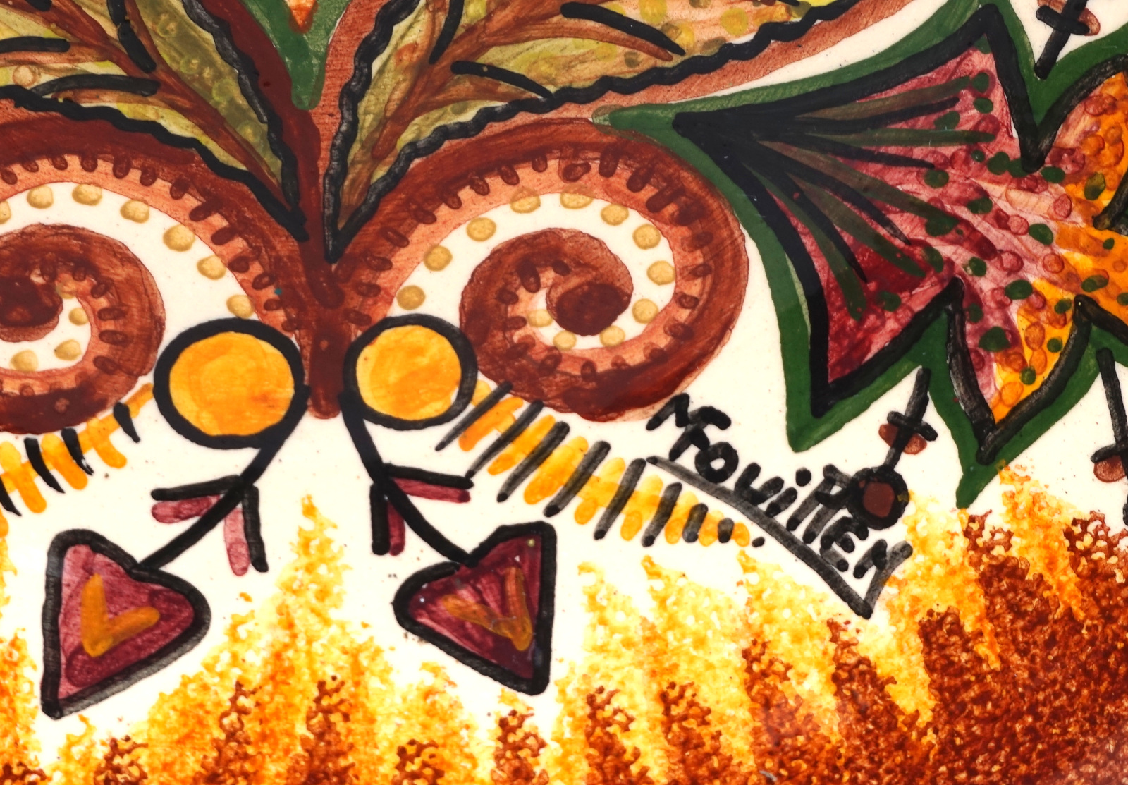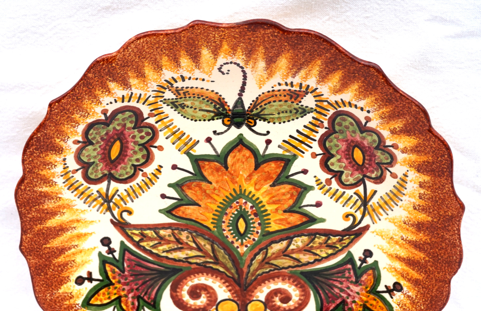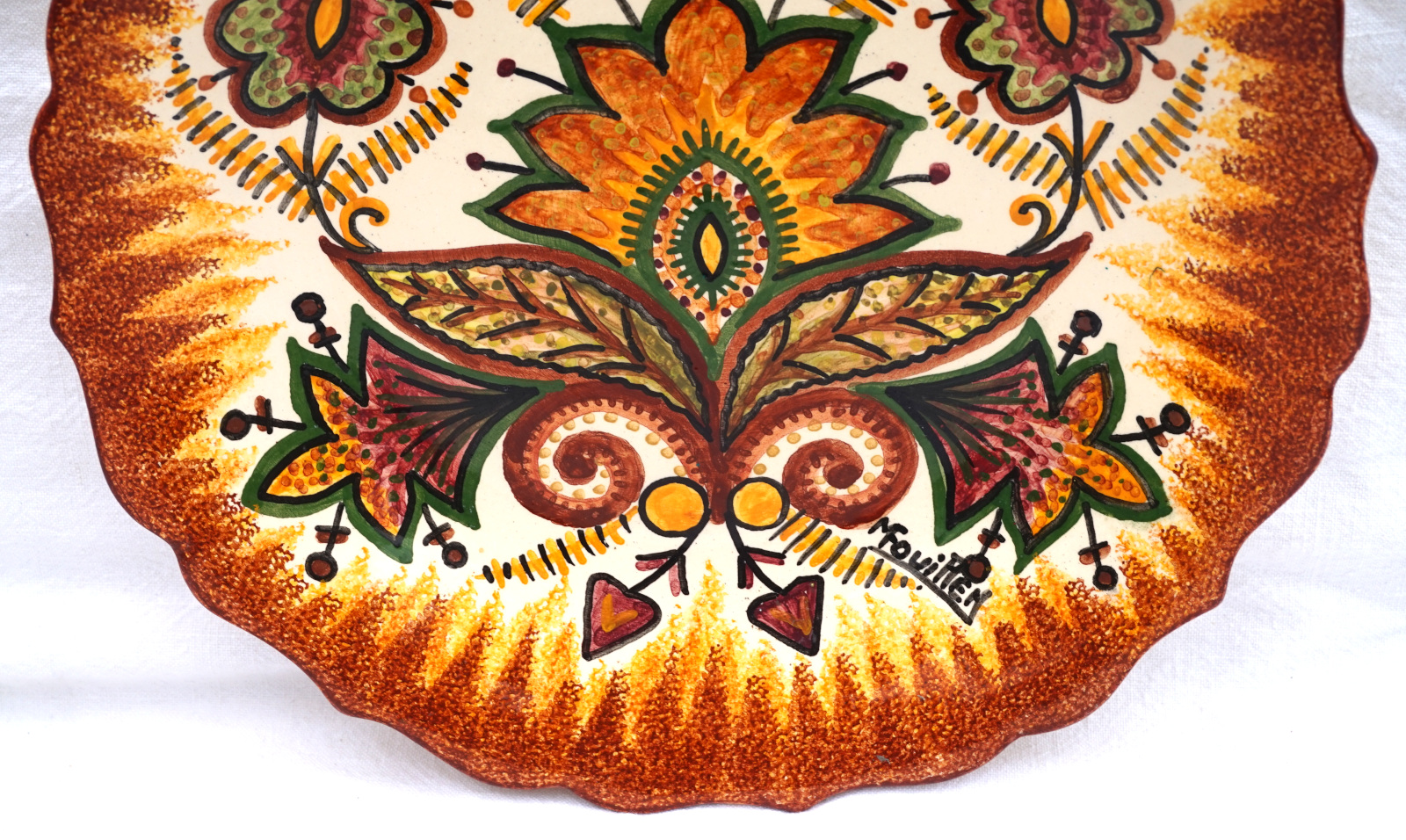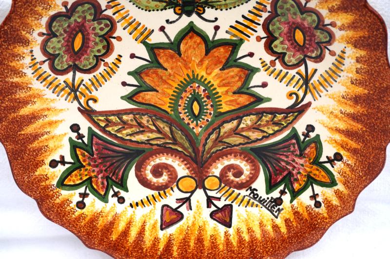 Vintage french hand painted faience plate showing flowers and dragonfly made by Maurice Fouillen in his father Paul Fouillen studio. It's signed on the back. 9 1/4" (23.5cm) diameter. Perfect condition with 2 holes for hanging.
