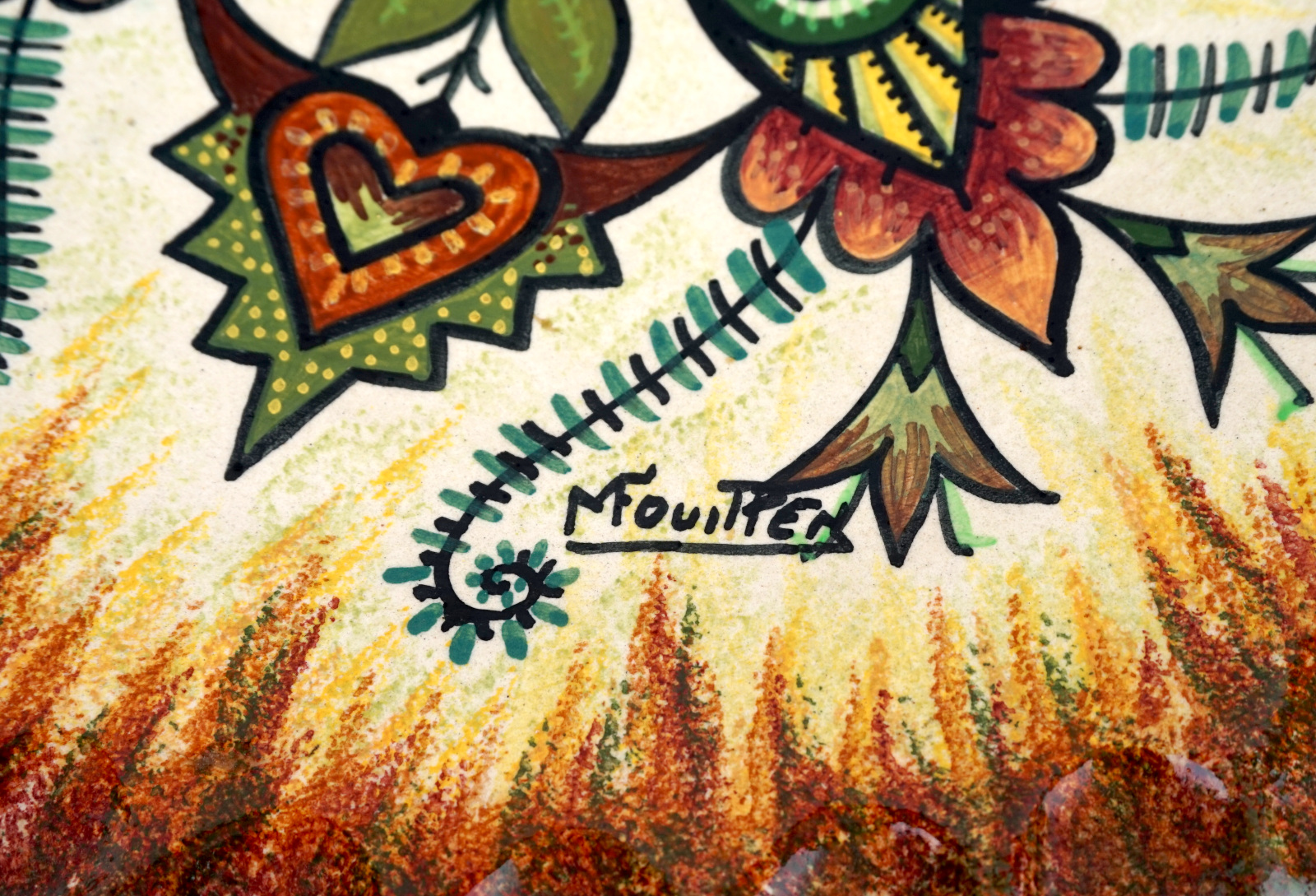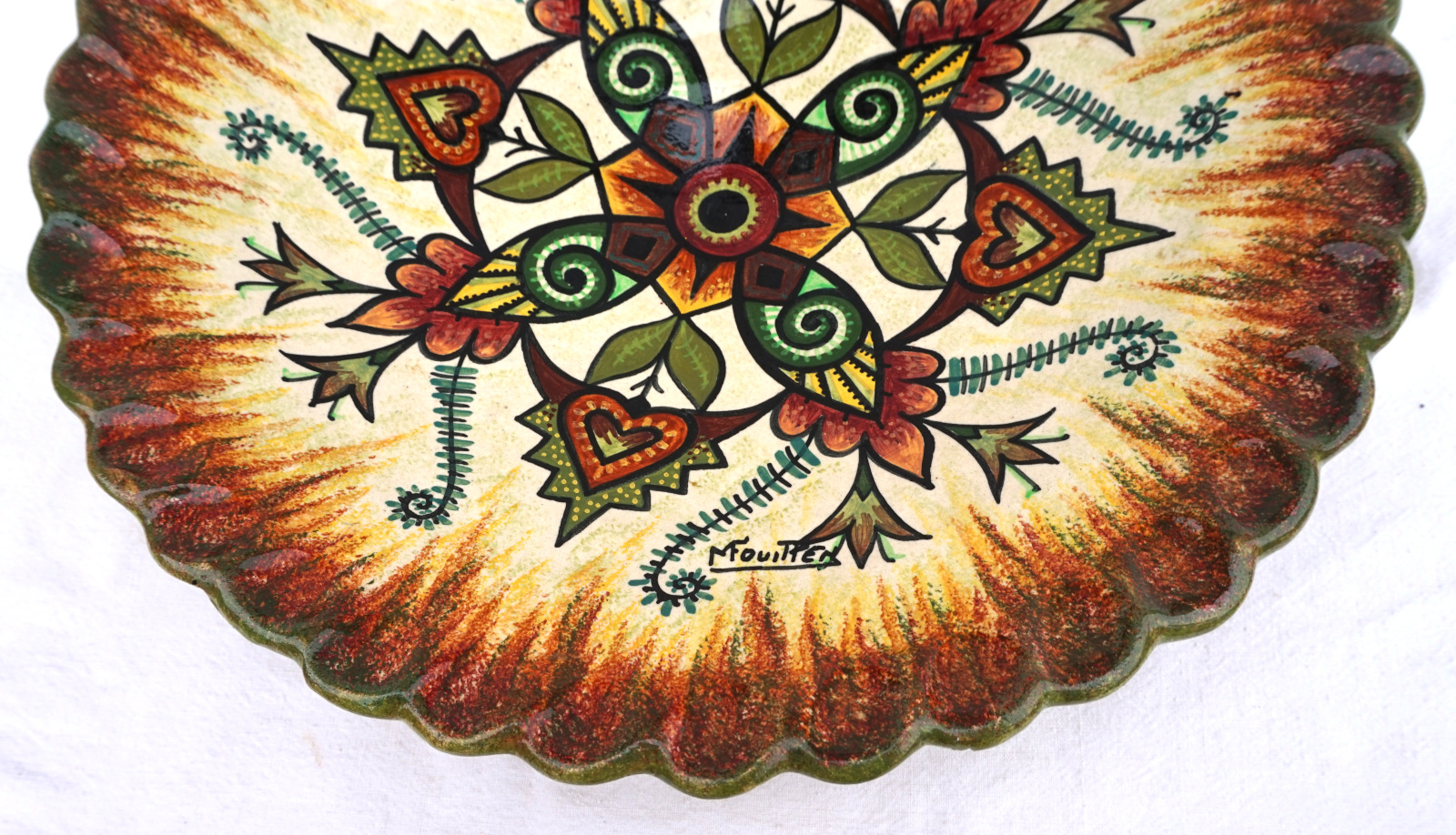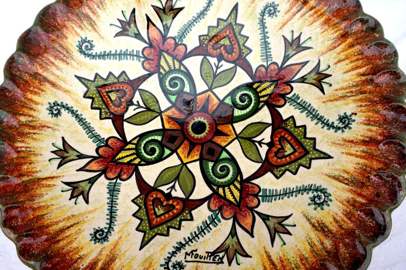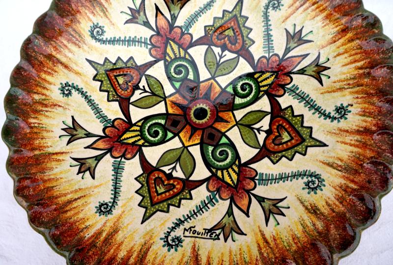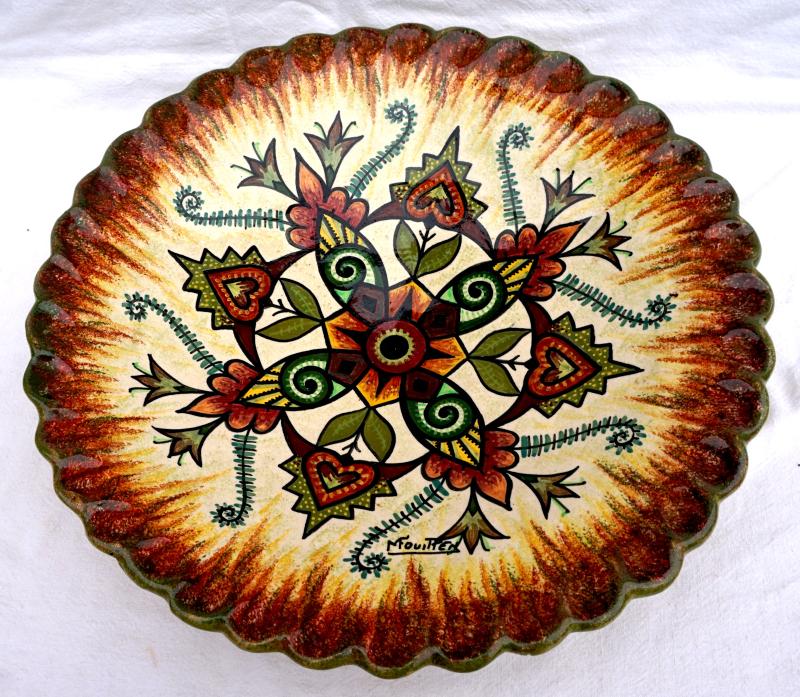 Grand plat décoratif reposant sur 4 pieds en faience peinte à la main d'un décor floral par Mauride Fouillen dans l'atelier de son père Paul Fouillen à Quimper, milieu XX° siècle. Il est signé dans le décor et sur son fond. Diamètre 38.7cm, hauteur 9.5cm. Parfait état.