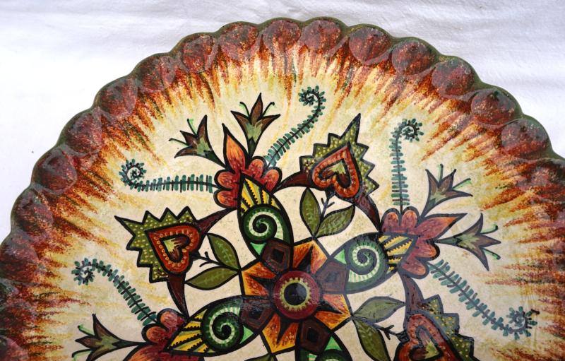 Vintage large footed dish centerpiece in hand painted faience showing floral decor made by Maurice Pouillen in his father Paul Fouillen studio in Quimper during the mid-century. It's signed in front and on the back. 15 1/4" (38.7cm) diameter, 3 3/4" (9.5cm) height. Perfect condition as shown by the following pictures.