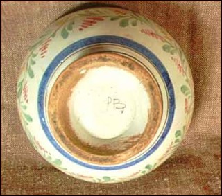 Bowl with Brittany pattern made by the famous Pouplard Beatrix factory in malicorne about 1890. The hand painting decor depicts a little Breton in the inside and flowers garland on the outside. It's signed on the back PBx. 5"1/2 tall 3"1/8 tall. Good condition only a few small chips on the border edge and on the pedestal as you can see on the pictures below.