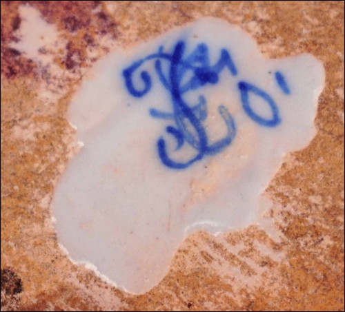 Encrier en faience de Desvres deuxième moitié du XIXe à décor Rouen par Emile Fourmaintraux. Signé sur son fond. 9 cm par coté, hauteur 4 cm. Bel état, l'encrier central est manquant.