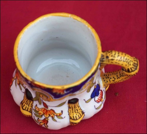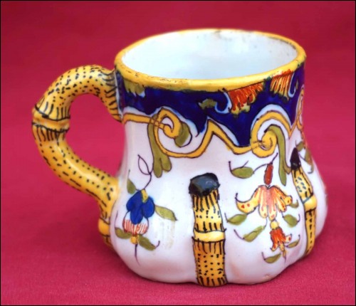 Petite tasse gobelet en faïence de Desvres par Fourmaintraux Frères vers 1880. Signé sur son fond? Hauteur 5.6 cm, largeur avec l'anse 8.5 cm.
