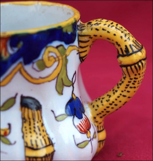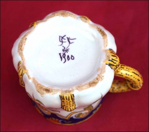 French hand painted faience small gobelet cup made by Fourmaintraux Freres in Desvres during the 1880's. It's signed on the back. 3 3/8" (8.5cm) width with the handle, 2 1/4" (5.6cm) height. Beautiful condition, tiny glaze shortages on the edge, as shown by the following pictures.