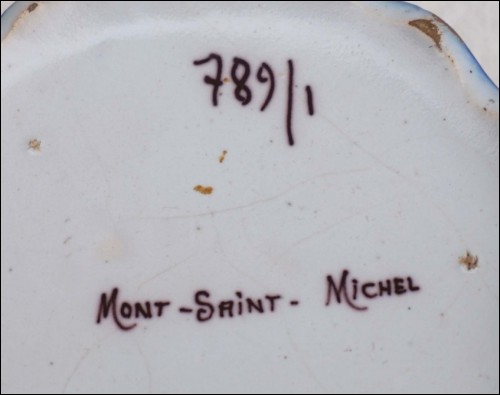 Bonbonnière en faience de Desvres à décor de Rouen pour le Mont St Michel par Fourmaintraux, fin XIX° siècle. Elle est signée sur son fond. Diamètre 10,5 cm, hauteur 8,5 cm. Très bel état.