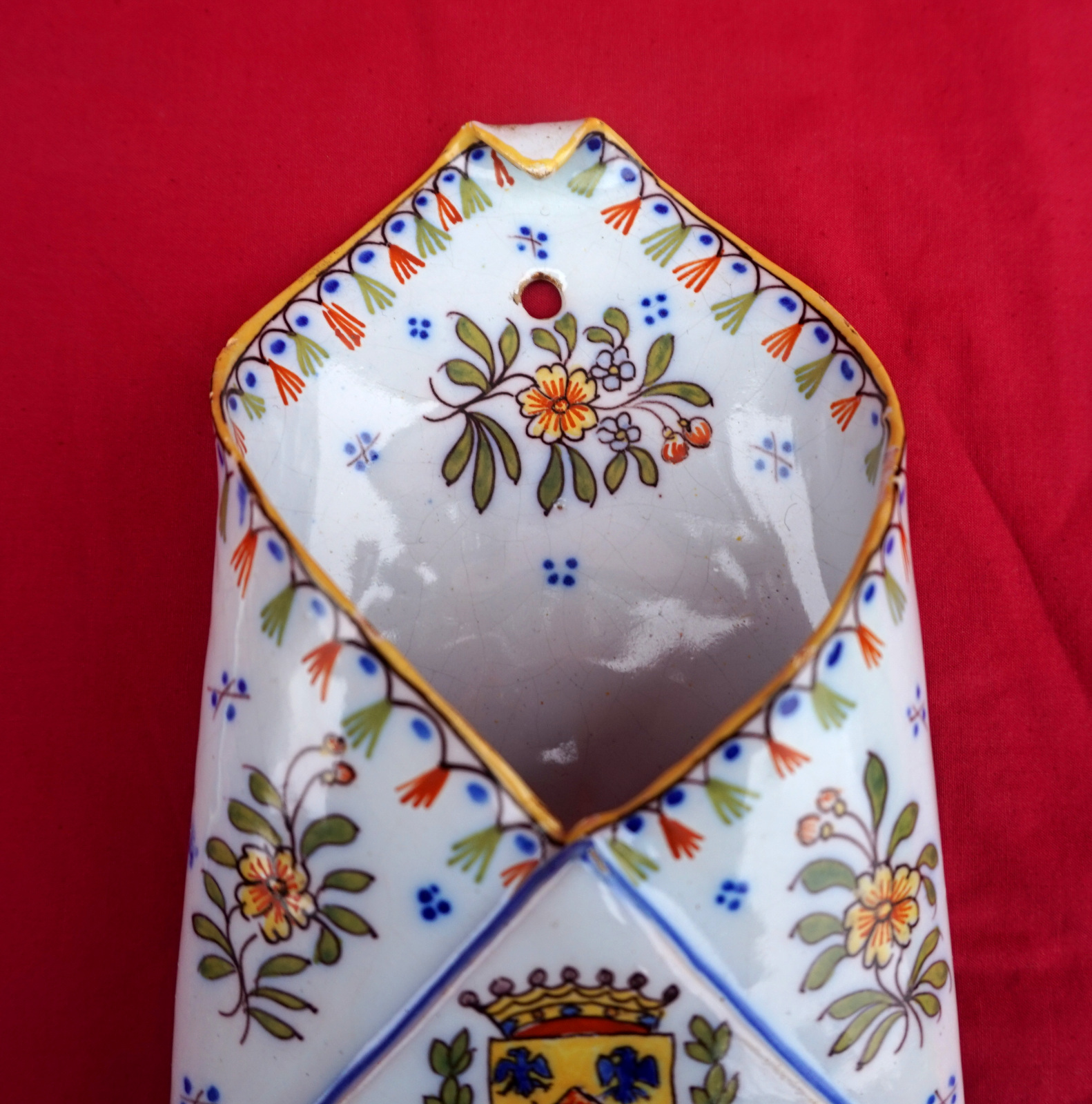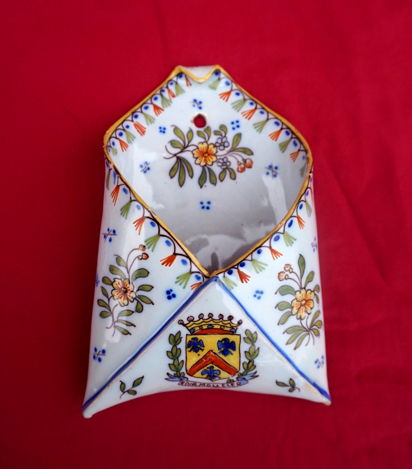 French hand painted faience letter wall pocket with coast of arms of Noimoutier by Géo Martel in desvres during the 1930's. It signed and numbered on the back. 6 1/4" (16cm) height, 4 1/4" (11cm) width. Perfect codition.