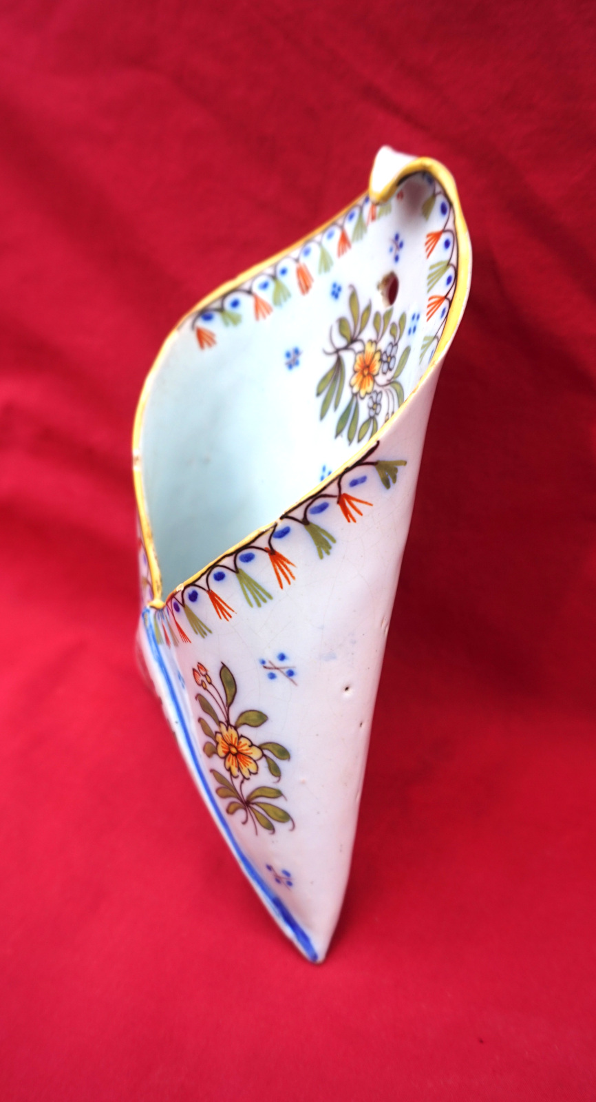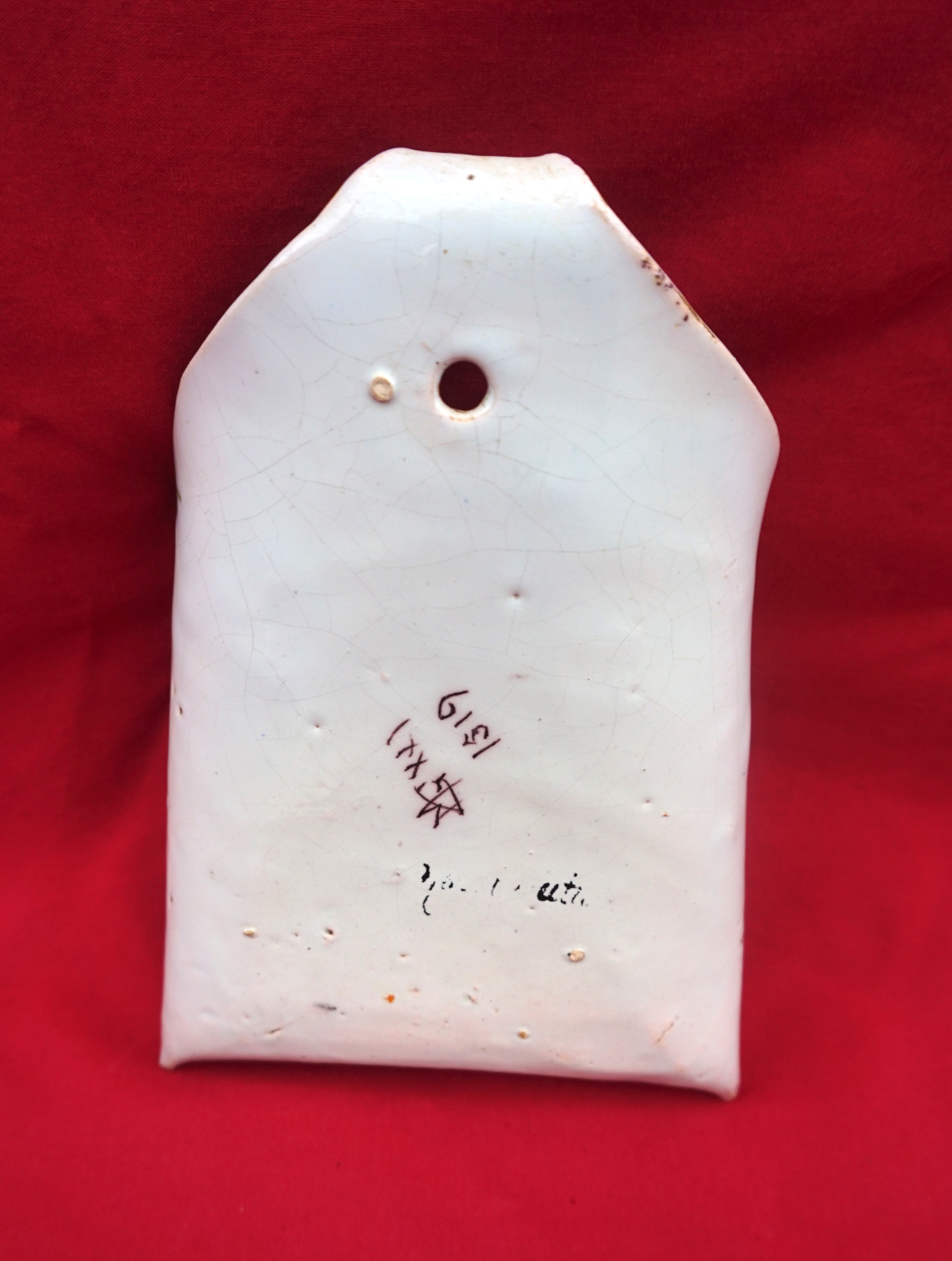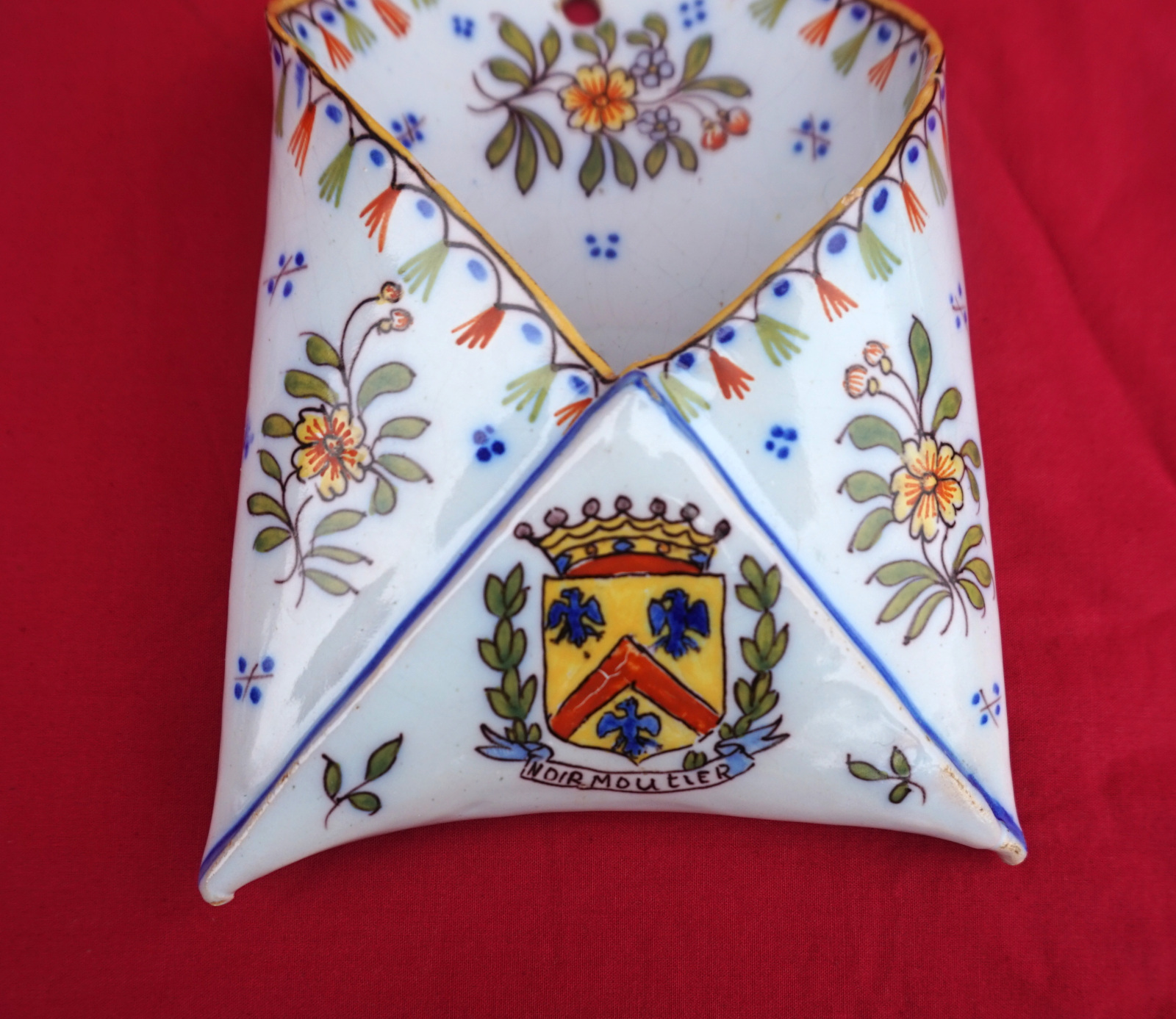 Bouquetière porte lettres mural  au blason de Noirmoutier par Geo Martel à Desvres vers 1930. Elle est signée et numérotée au dos. Hauteur 16 cm, largeur 11 cm. Parfait état.