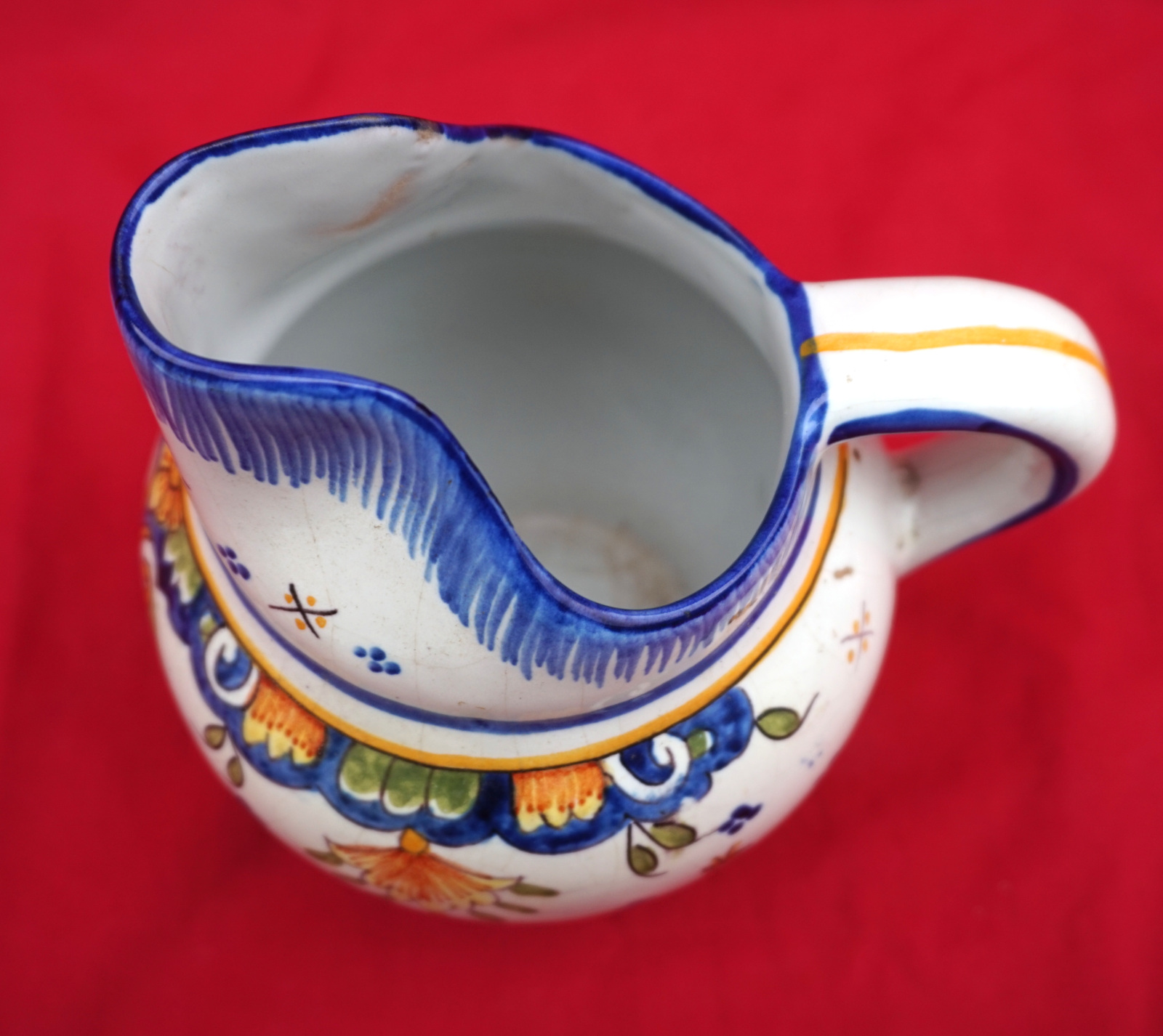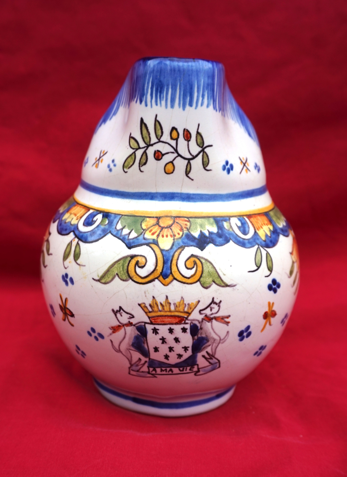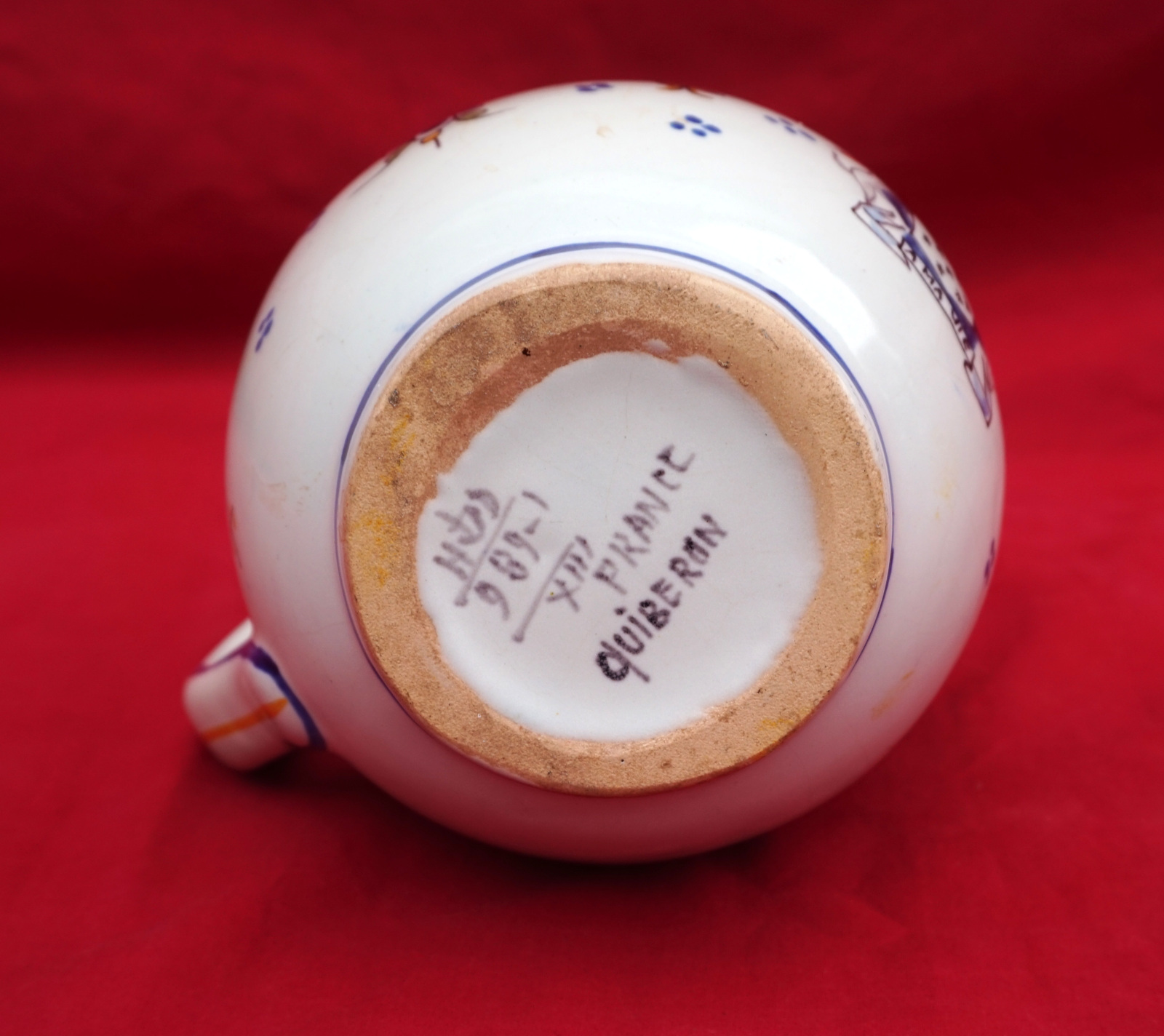 French hand painted faience pitcher or creamer showing the coat of arms of Quiberon near Quimper made by Henri Delcourt in Desvres during the 1910's. It's signed on the back. 6 1/2" (16.5cm) height, 6" (15.3cm) with from the handle to the spout. Perfect condition as shown by the following pictures.