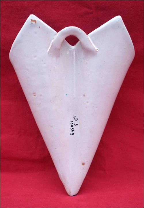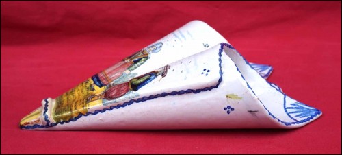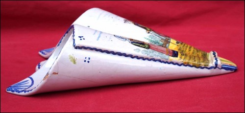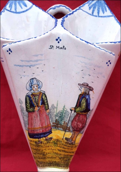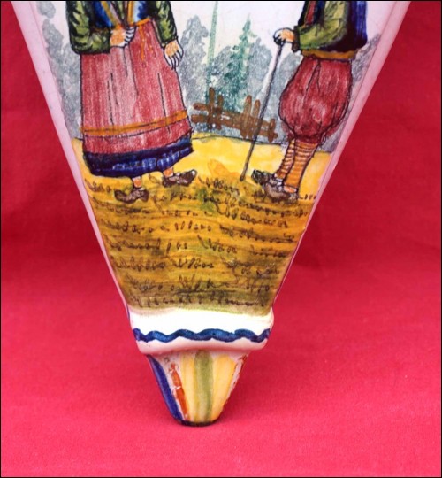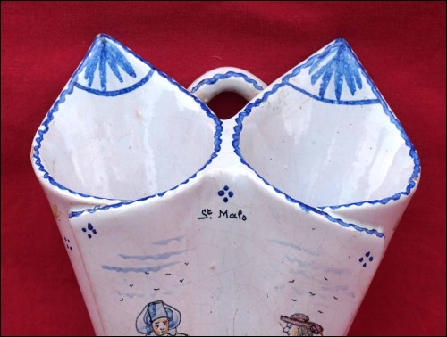 Double cornet wall pocket made by the Desvres factory for the town of St Malo around 1920. The hand painting pattern depicts a couple of Breton in traditional costume on a white background surrounded by blue border edge.It's signed on the back and has unfortunately chips on the left side as you can see on the pictures below.8" 1/8 high 5" 1/4 width.