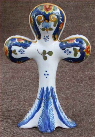 Bougeoir en forme d'hermine en l'honneur de la ville de St Lunaire avec les armes de Bretagne et la devise " A ma vie". Il est au décor Rouennais et fait à la manufacture de Jules Verlingues à Desvres vers 1910. Pied accidenté . Hauteur 13 cm largeur 9 cm.