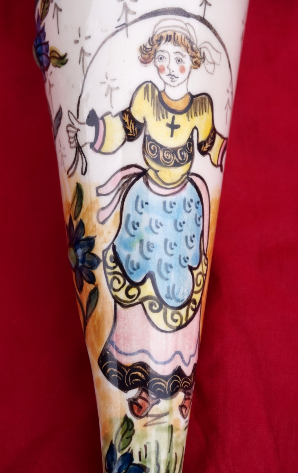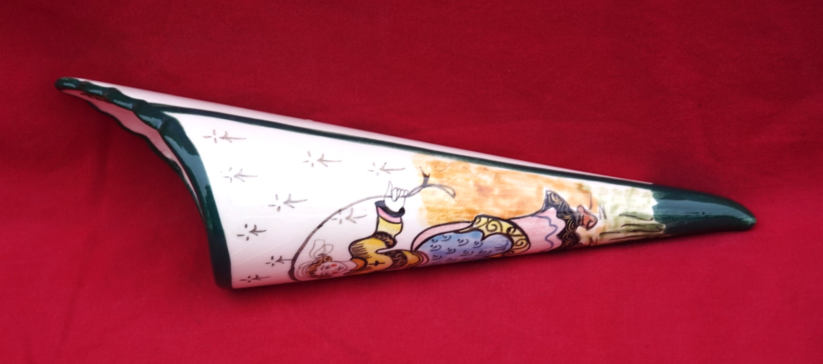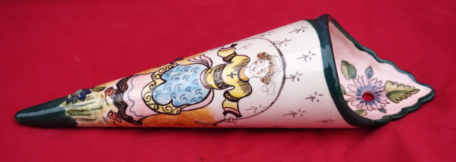 Cornet mural en faience peinte à la main d'un bretonne  par Jacques Taillandier vers 1980. Il est signé sur son fond. Hauteur 23 cm, largeur 6cm, profondeur 5.2 cm. Parfairt état.