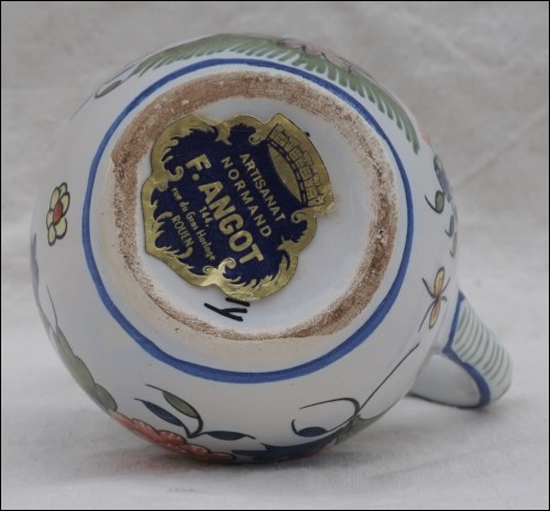 French hand painted faience small pitcher or creamer showing sinceny decor made by Rouen for Angot during the 1970's. It has a paper label and signature on the bottom. 3 7/8" (10cm) height, 2 3/4" (7cm) diameter. Perfect condition as shown by the following pictures.