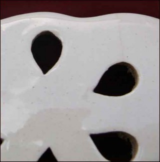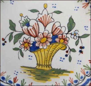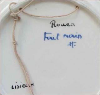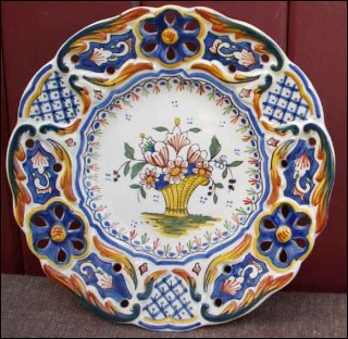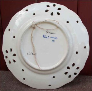 Assiette ajourée en faïence à décor Rouen pour Lisieux vers 1890. Elle est peinte à la main d'une corbeille de fleurs. Elle est bon état, juste un cheveu de cuisson. Elle est signée sur son fond. Diamètre 23 cm.