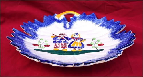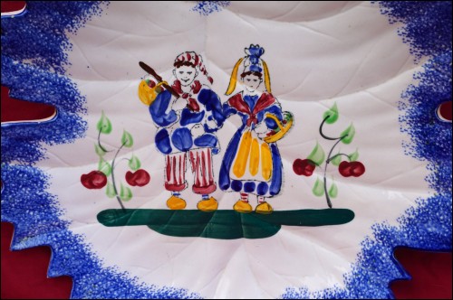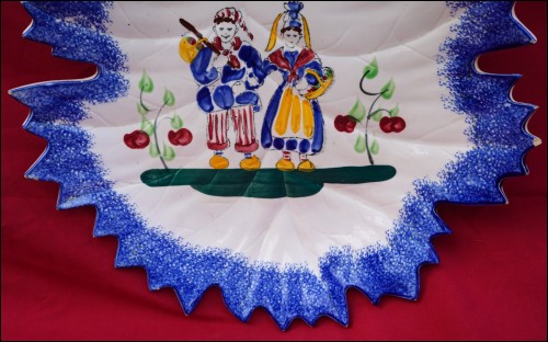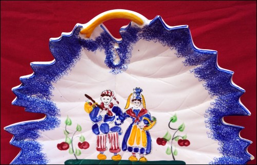 Plat de service en forme de feuille à décor d'un couple de Normands en costume par MBFA Pornic vers 1960's. Il est signé sur son fond. Diamètre 32.4cm, profondeur 4.8cm. Bel état, quelques très petites égrenures sur les bords.