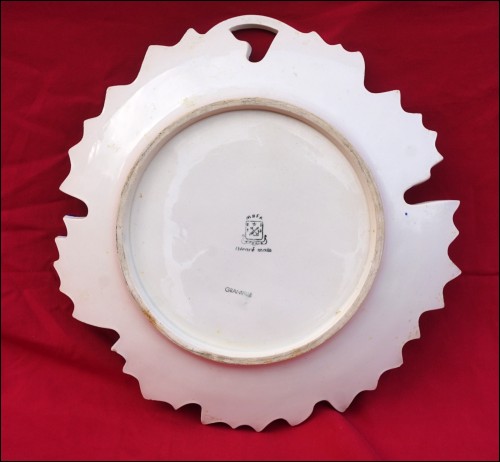 French hand painted faience large leaf shaped dish showing a couple of Normand, Grandville, made by MBFA in Pornic during the 1970's. It's signed on the back. 12 3/4" (32.4cm) diameter, 1 7/8" (4.8cm) depth. Good condition tiny chips on the edge as shown by the following pictures.