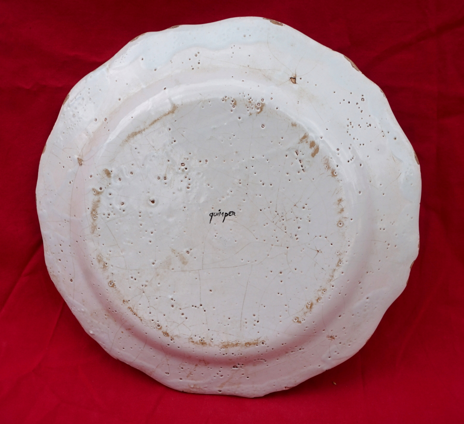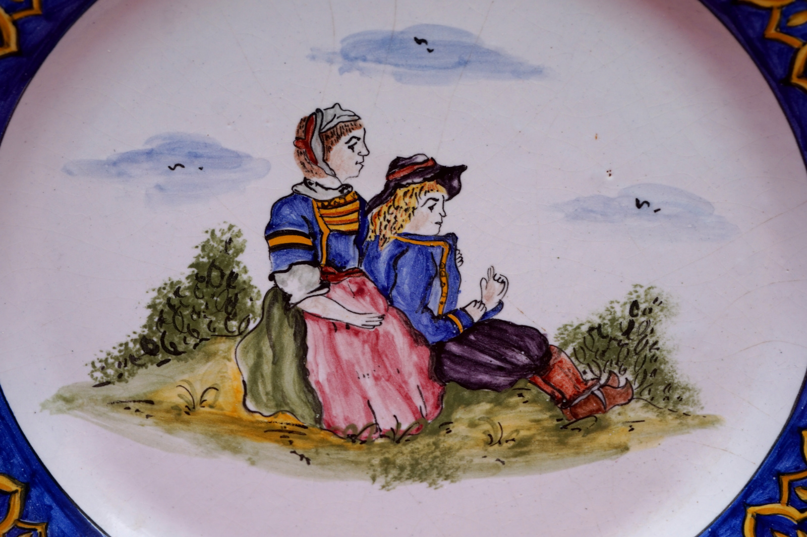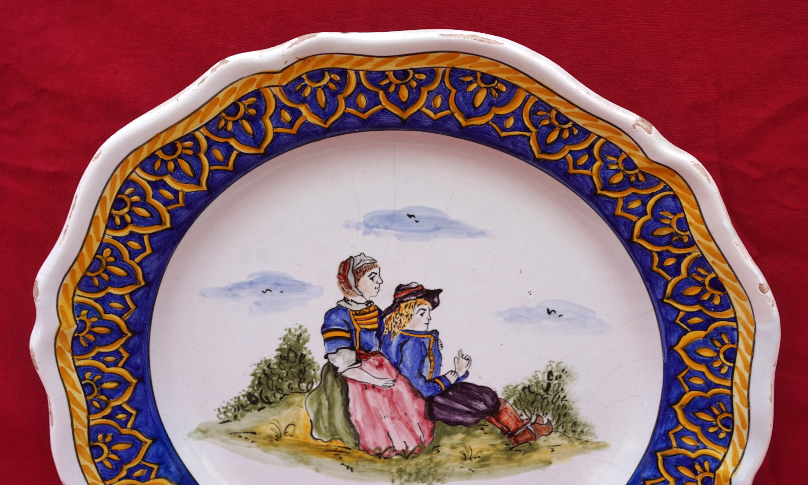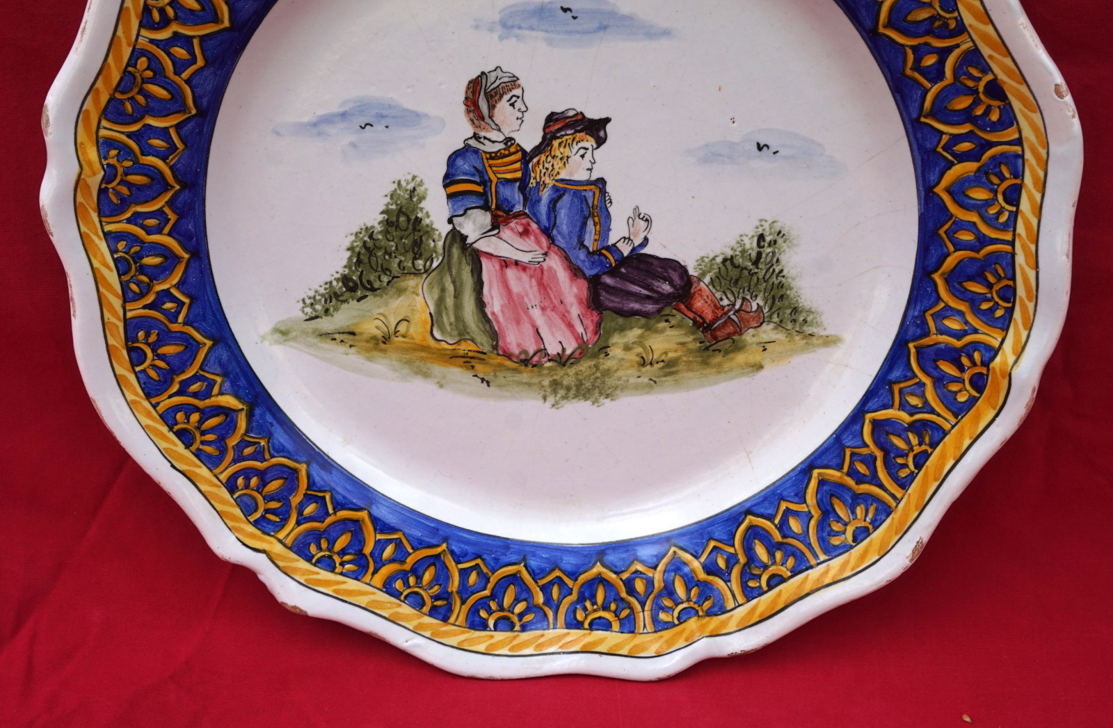French hand painted faience dish showing Couple of Breton surrounded by a large border scalloped dish. 11" (28cm) diameter. It's signed Quimper on the back. Beautiful condition a few glaze shortages.