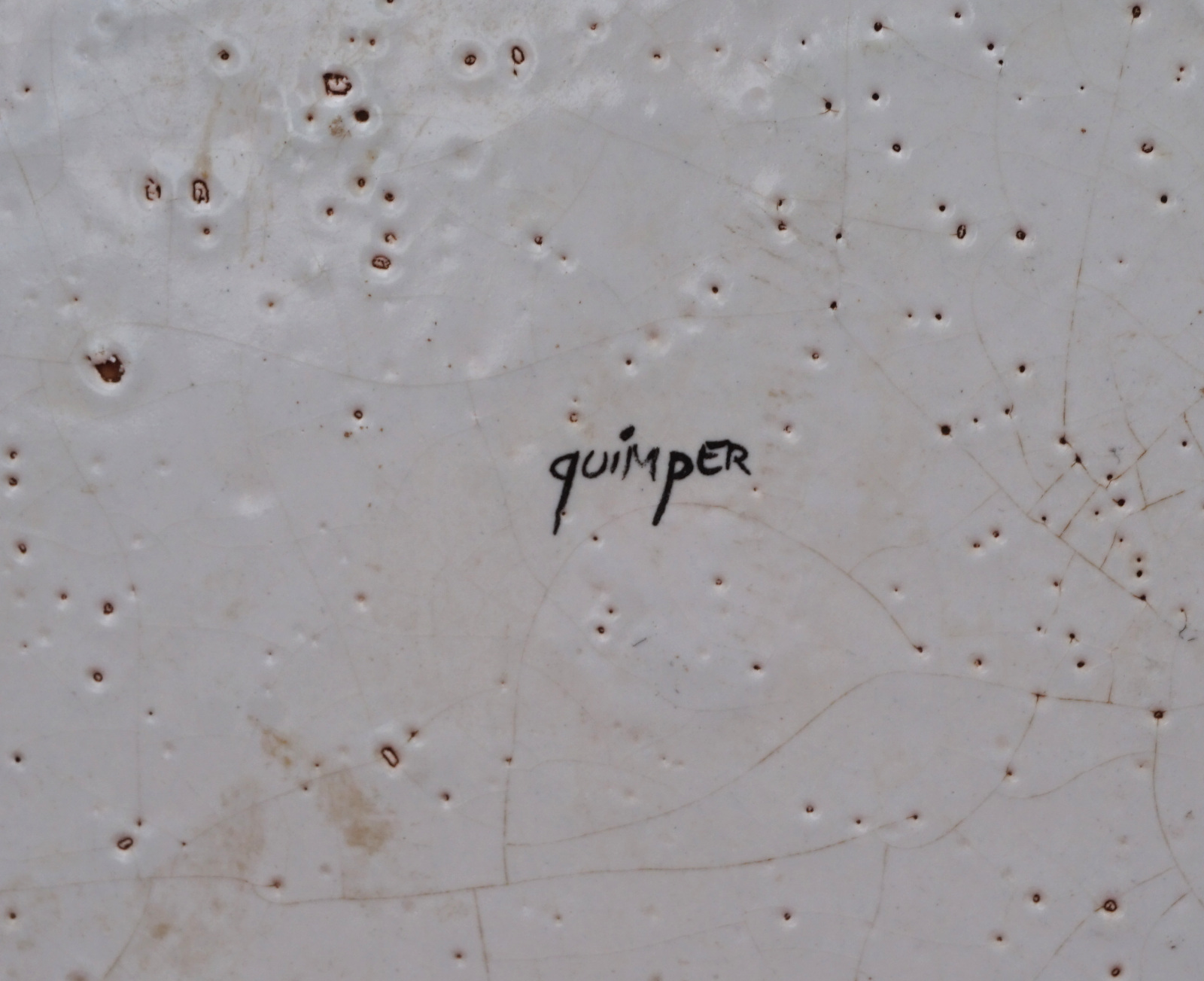 Grand plat rond à décor d'un couple de Bretons entouré d'une bordure d'inspiration décor "riche". Il est signé Quimper sur son fond. Diamètre 28 cm. Très bel état.