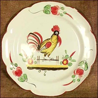 This decorative plate has been made probably in Luneville around 1970. The traditional decor of rooster is hand painting. Good condition it's not signed. 9" diameter.