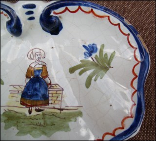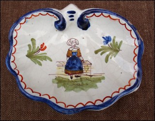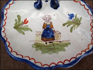 French majolica scalloped shell shaped dish butter made by G Fourmaintraux in Desvres factory during the 1930's. The hand painting pattern depicts a little bretonne in traditionnal costume on a white background with blue edge. Good condition only small glaze shortage as you can see on the pictures below. It's signed on the back. 5"1/8 by 4"1/8 width 1" high.