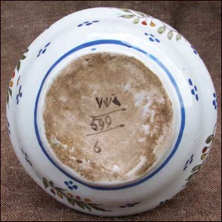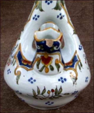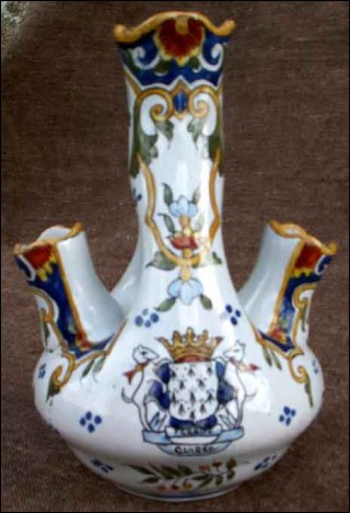 Antique tulip vase in French majolica made by the famous Jules Verlingues factory in desvres around 1910. The hand painting pattern shows the Brittany arms on a Rouen decor. Good condition only a small chip on the edge as you can see on the pictures below. It's signed on the bottom. 7" high 4"1/2 diameter.