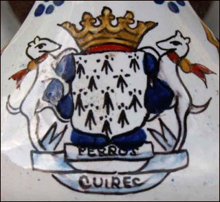 Vase tulipier à décor Rouennais en l'honneur de la ville de Perros Guirec de la manufacture de Jules Verlingues à Desvres vers 1910. Sur sa face les armes de Bretagne et la devise "A ma vie". Bon état juste une petite grenure sur un des cols.Il est signé sur son fond. Hauteur 17.5 cm diamètre 11.5 cm.