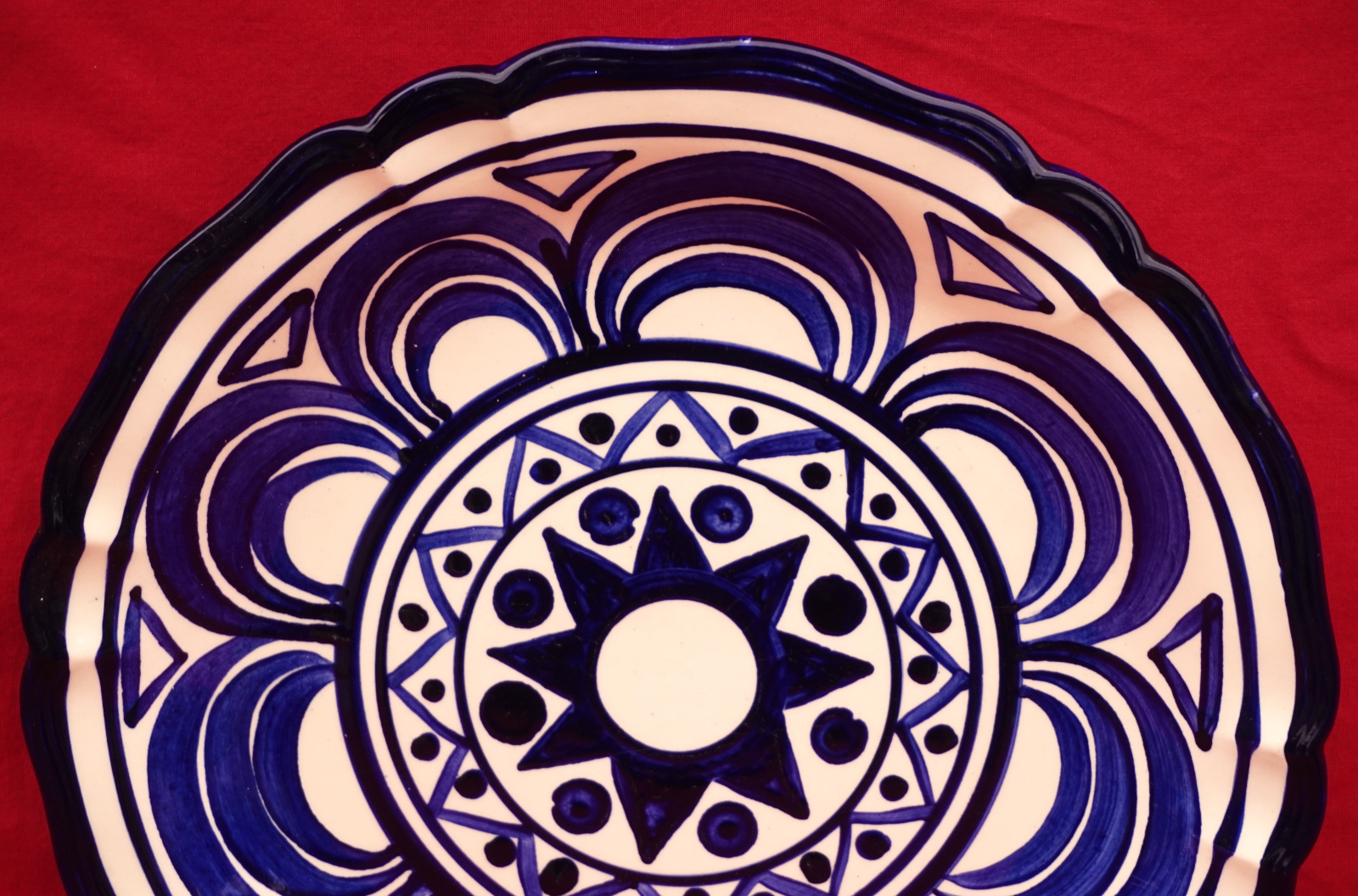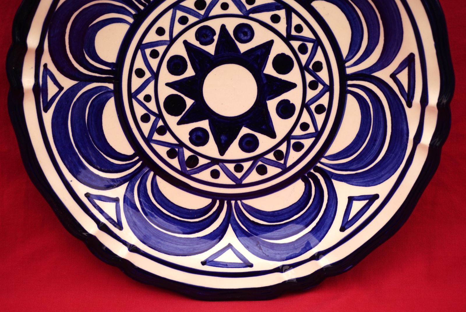 Assiette en faïence bleue et blanche  à décor géométriques , St Jean de Bretagne vers 1960. Elle est signée sur son fond. Diamètre 25.5 cm. Parfait état.